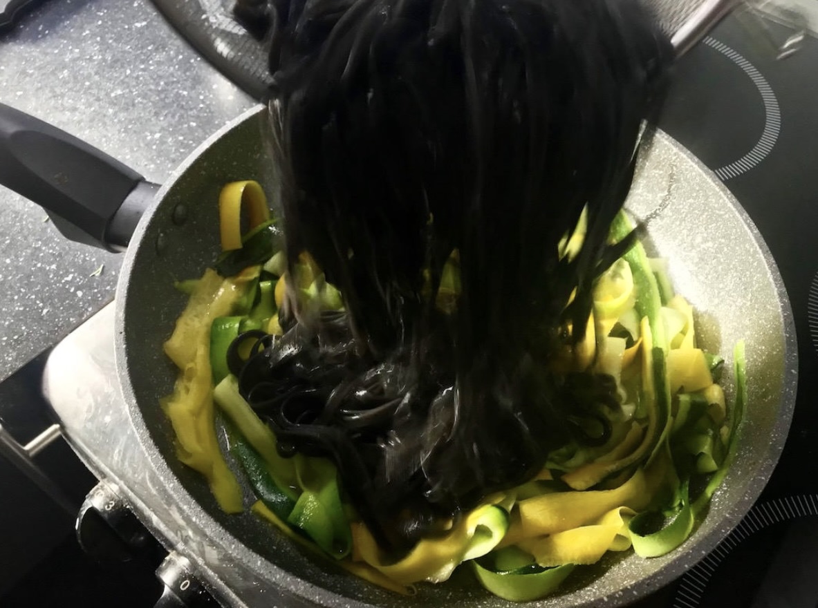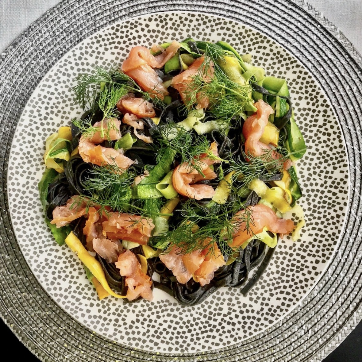 Czarny makaron z łososiem jest to makaron zabarwiony atramentem mątwy połączony z tagliatelle warzywnym z cukinii oraz z dodatkiem wędzonego łososia. To prosta i błyskawiczna kombinacja wybornych smaków. Barwiony sepią makaron ma niesamowity, czarny kolor i bardzo delikatny posmak morza. Znakomicie kontrastuje z kolorowymi warzywami, czy właśnie wędzonym łososiem. W daniu użyłem linguine, czyli stosunkowo cienkiego i płaskiego makaronu. Dobrze, aby cukinie pokroić w zbliżonej grubości paski. Wtedy danie na talerzu prezentować się będzie jeszcze lepiej. Łosoś koniecznie powinien być wędzony na zimno, ewentualnie surowy, ale wtedy należy go lekko podsmażyć z cukinią.