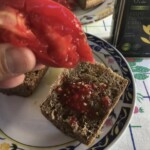 Przyrządzanie Dakos: Na przygotowanych kromkach pieczywa (lub sucharkach) ułóż starty miąższ pomidorowy. Przyjęło się, że na jednego dakosa używa się mniej więcej jednego pomidora.