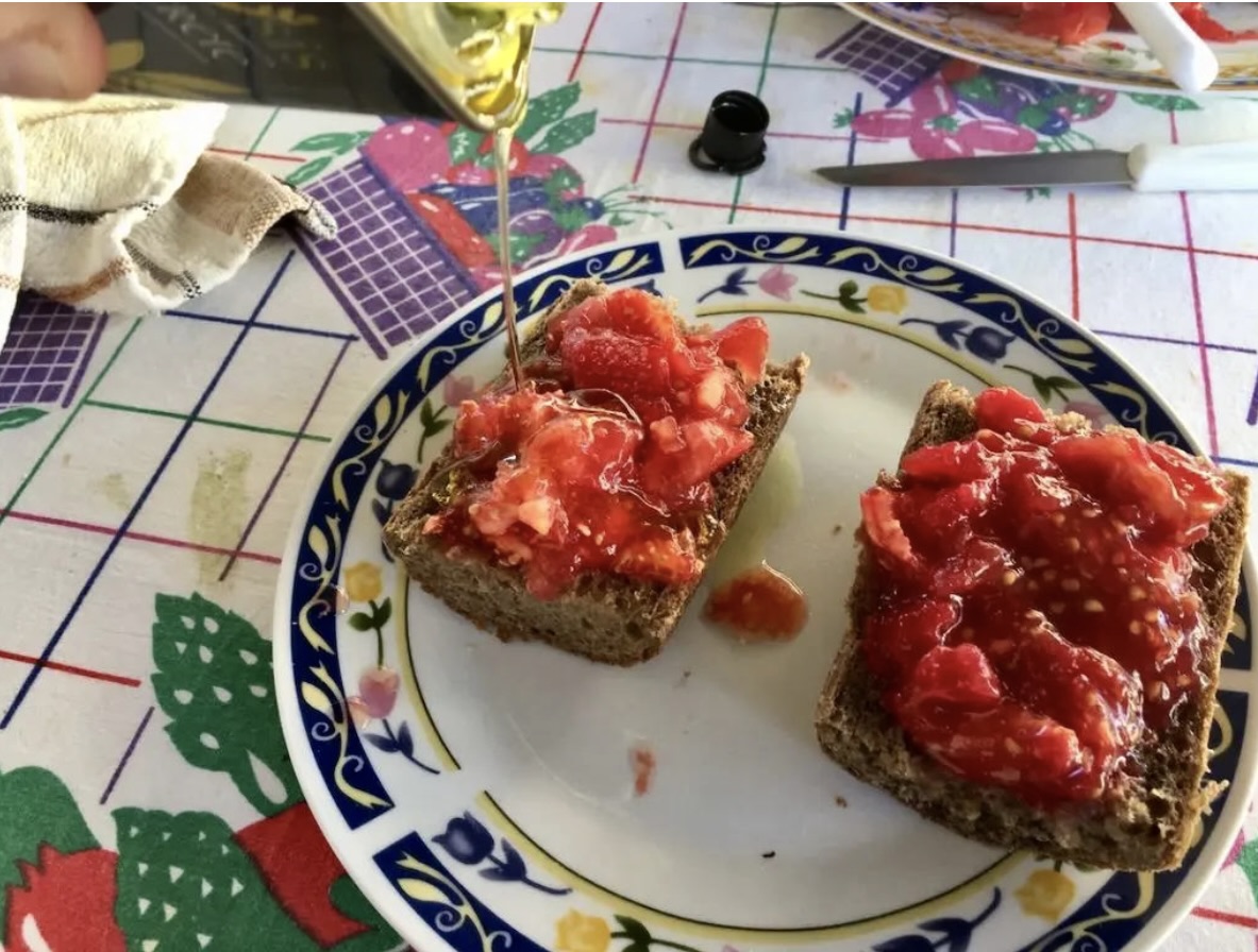 Oliwa: Obficie skrop pomidory oliwą extra virgin. Nie żałuj jej – ma ona wsiąknąć również w pieczywo.
