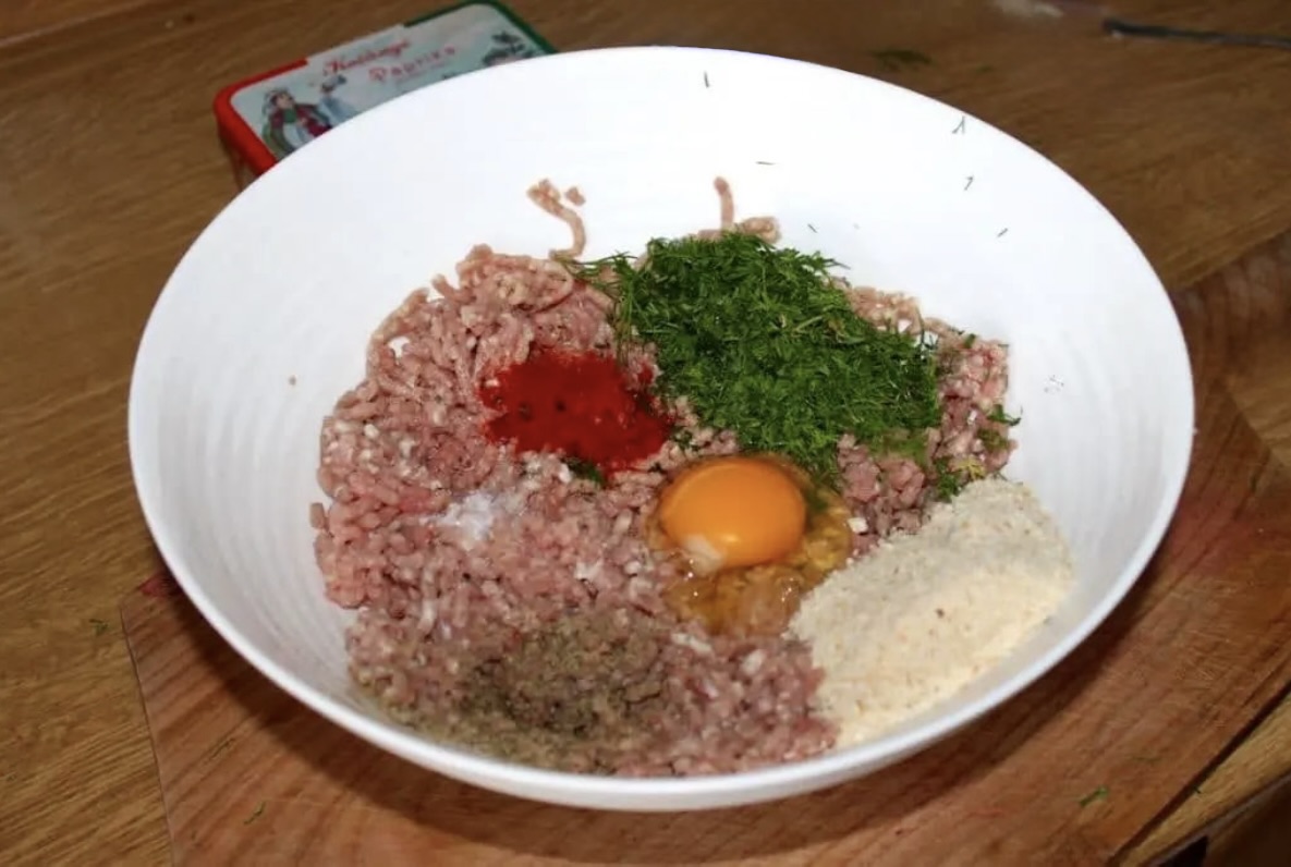 Do mięsa dodaj posiekany koperek, wbij jajko, dodaj 1 łyżkę bułki tartej, 1 łyżeczkę słodkiej, mielonej papryki, a także sól i pieprz.