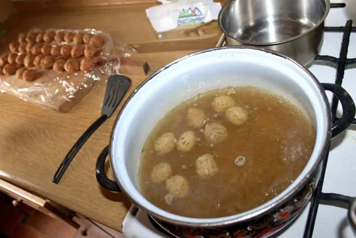 W dużym garnku zagotuj domowy bulion warzywny i wrzuć klopsiki.