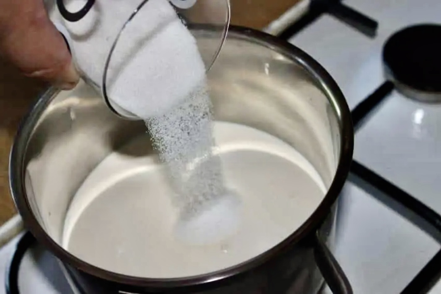 Gotowanie śmietanki: Do rondelka wlej śmietankę i wsyp cukier. Dokładnie wymieszaj.