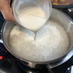 Gotowanie bazy: W garnku zagotuj 300 ml mleczka kokosowego (resztę zostaw na koniec) oraz 100 ml napoju kokosowego. Dodaj cukier oraz opcjonalnie wanilię.