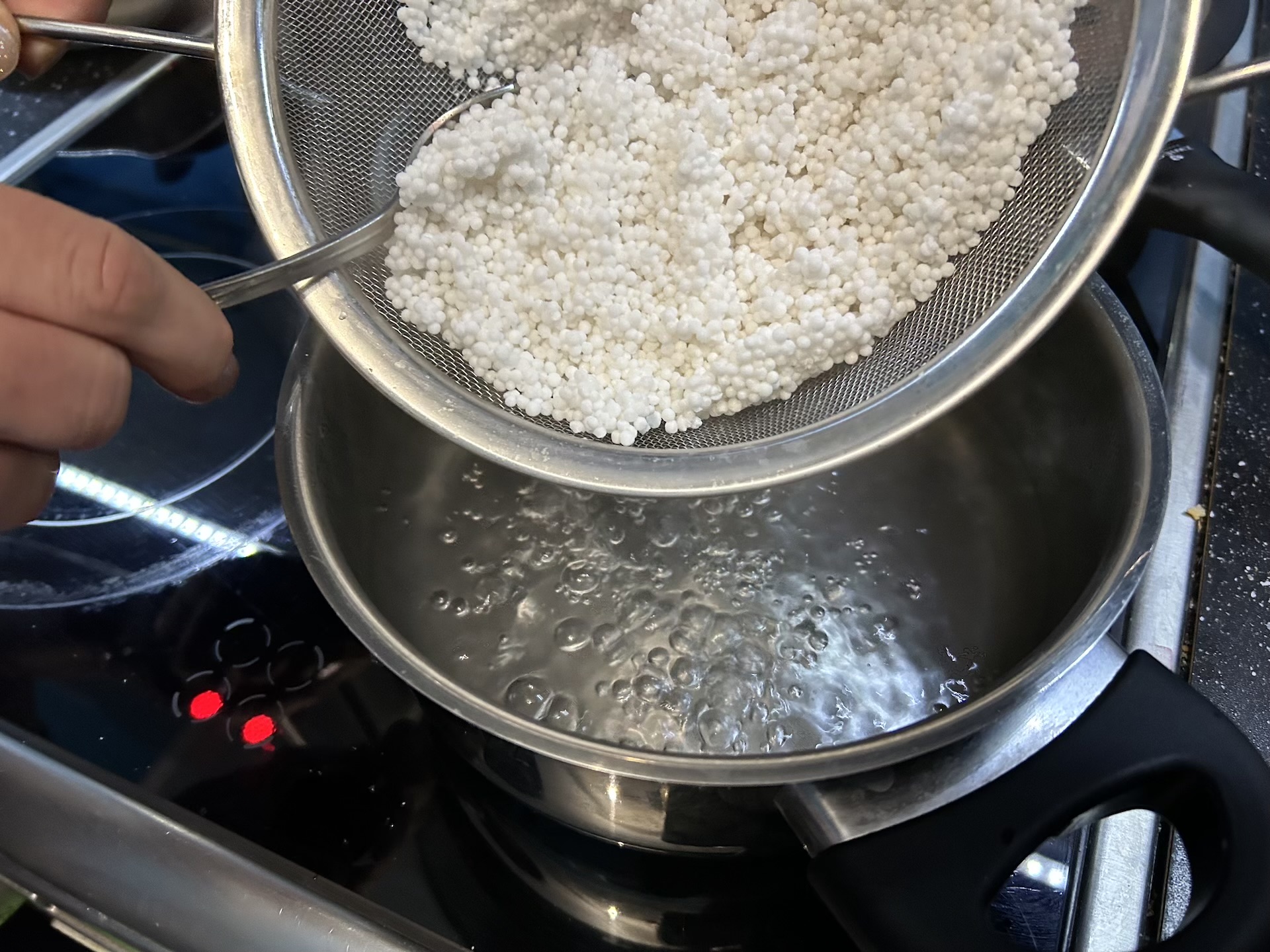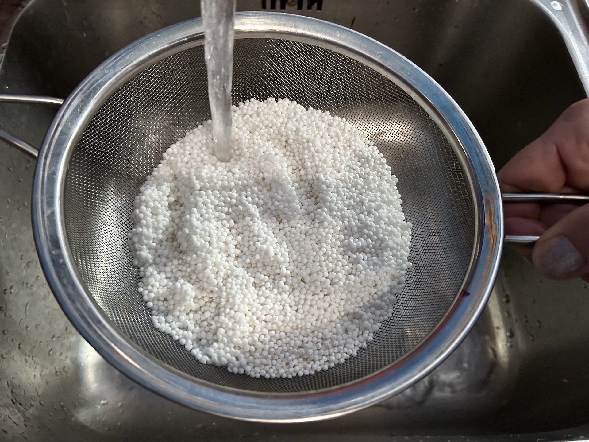 Płukanie: Tapiokę przepłucz na sicie pod bieżącą wodą. Odradzam moczenie kuleczek przed gotowaniem, ponieważ niewiele to wnosi.