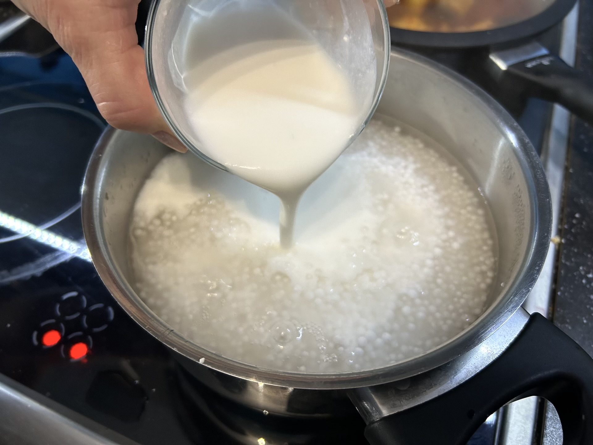 Tapioka gęstnieje podczas stygnięcia, więc dolanie mleczka na końcu pomaga utrzymać delikatną strukturę.