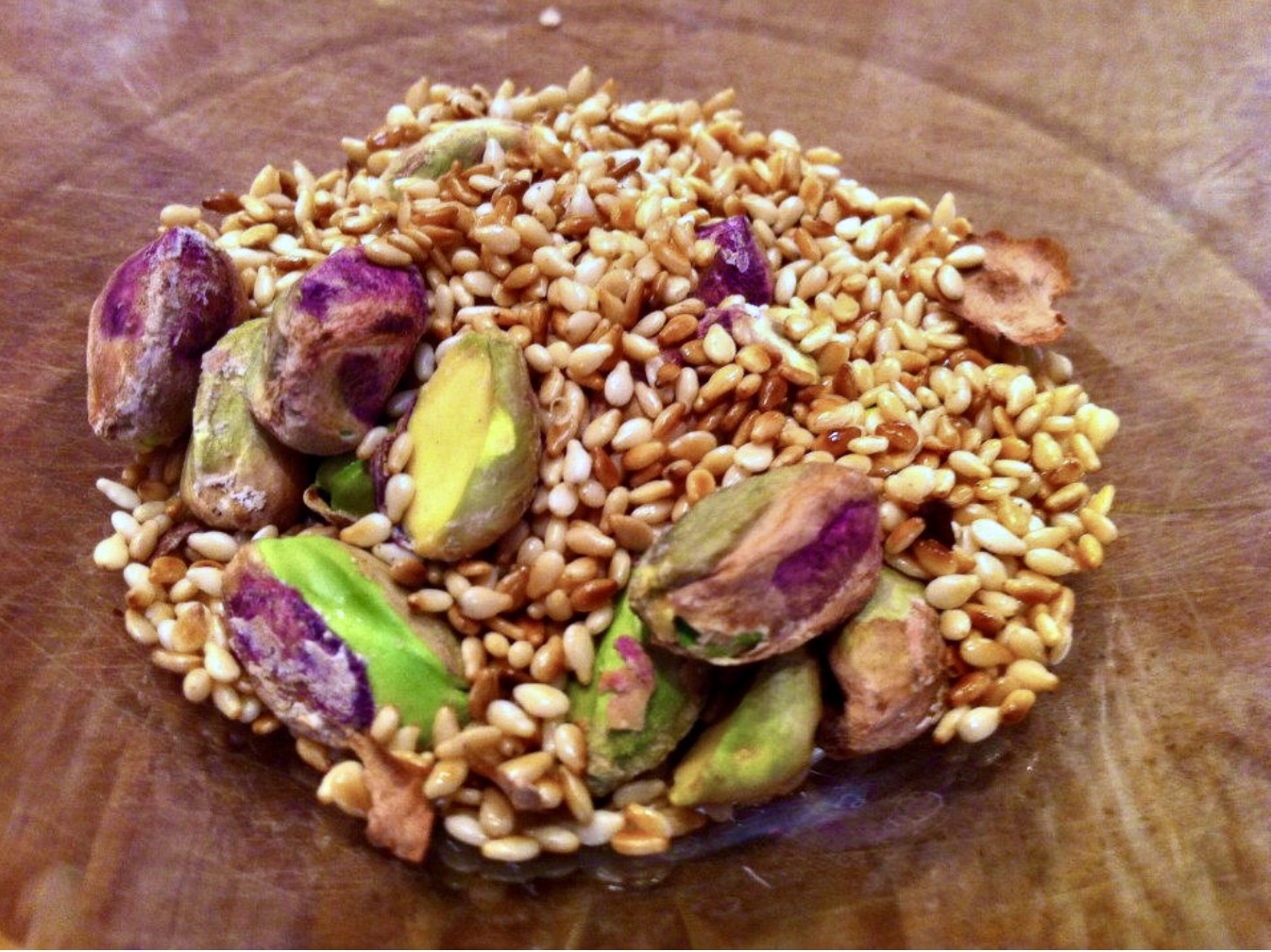 Upraż na suchej patelni 2 łyżki orzechów pistacjowych. Po chwili dodaj 2 łyżeczki sezamu (aby sezam się nie spalił) i praż do momentu, aż się zarumienią.