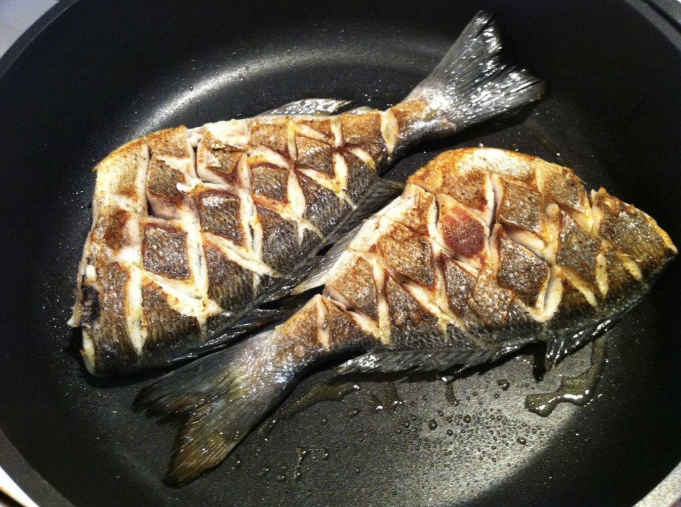 Na mocno rozgrzaną patelnię wrzuć dorady, a następnie smaż po kilka minut z każdej strony, aż będą ładnie zrumienione.