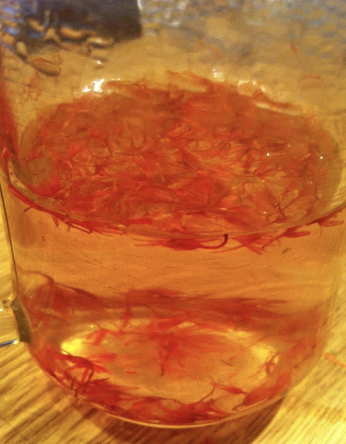 W międzyczasie do połowy szklanki gorącej wody wrzuć 1 łyżeczkę szafranu, aby woda zabarwiła się na złoty kolor.