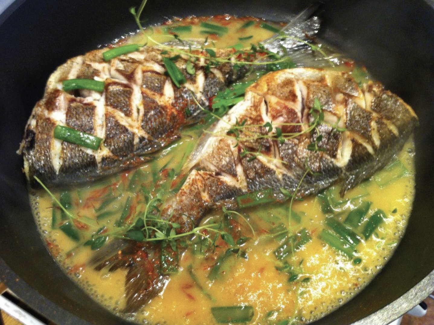 Gdy ryba będzie zrumieniona, wlej na patelnię wodę z szafranem i dodaj 1 łyżeczkę harissy.