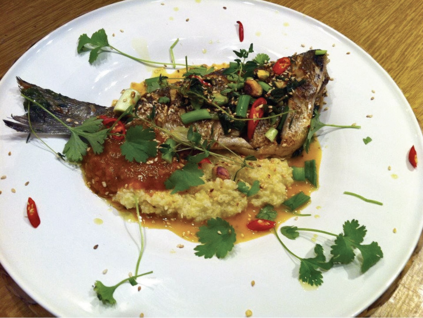 Dorada duszona, a przyprawiona i podana na sposób marokański to nic innego, jak aromatyczna smażona ryba podana z kuskusem i doskonałą, cytrynową salsą z dodatkiem moreli i rodzynek. Całe danie posypane jest uprażonym ziarnem sezamu i pistacjami, płatkami chili i listkami świeżej kolendry. Chyba brzmi dobrze, prawda? Na talerzu same smaki słonecznego Maroko. Mnie udało się zrobić to danie w 20 minut. Dasz radę szybciej?