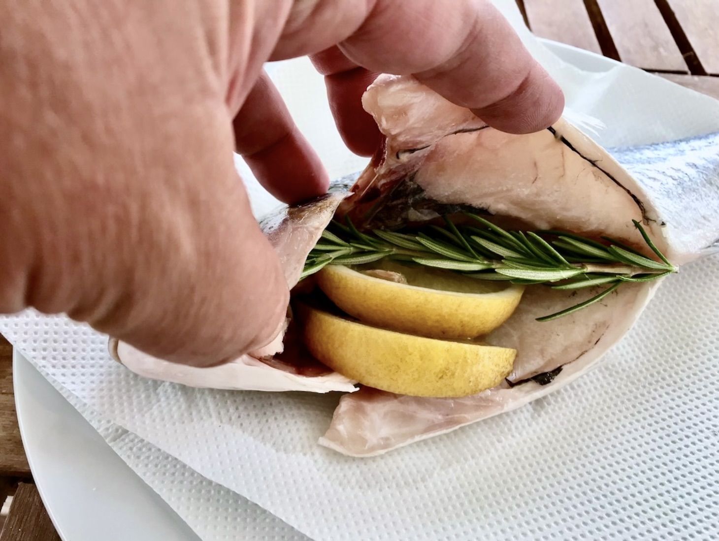 Włóż do środka plastry cytryny oraz gałązki rozmarynu. Zepnij brzuch ryby wykałaczkami.