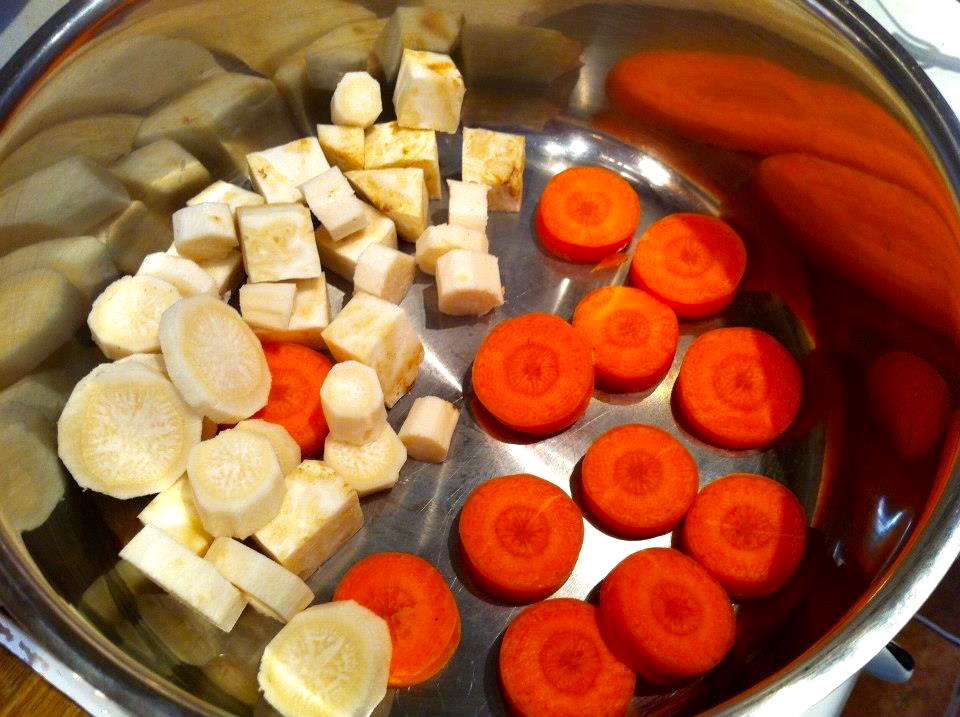 Warzywa: Korzeniowe warzywa obierz, a następnie pokrój w kawałki. Przelej je wrzątkiem na sitku, odcedź po 2 minutach i odstaw.
