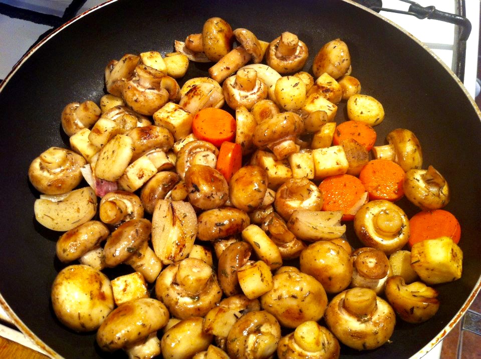 W misce wymieszaj zblanszowane wcześniej warzywa korzeniowe, pieczarki i szalotki z 2 łyżkami oliwy.