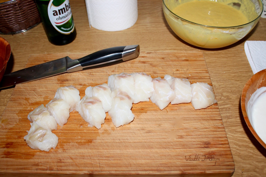 Pokrój polędwiczki z dorsza na średniej wielkości kawałki (takie „na jeden kęs”).
