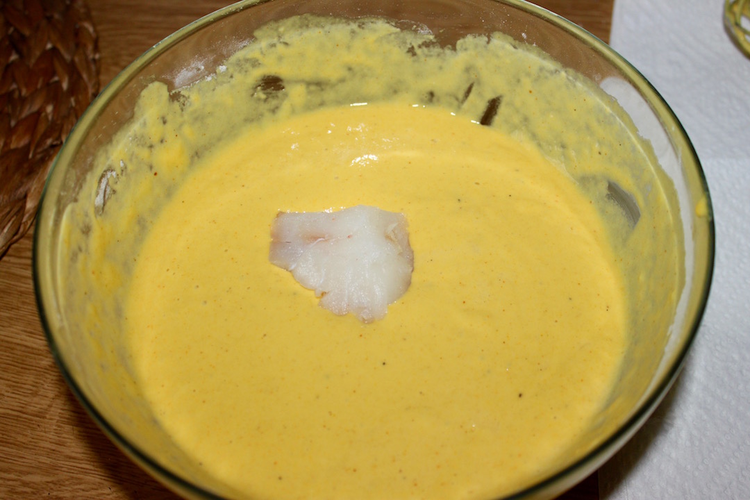 Każdy kawałek ryby dokładnie obtocz w przygotowanym cieście piwnym.