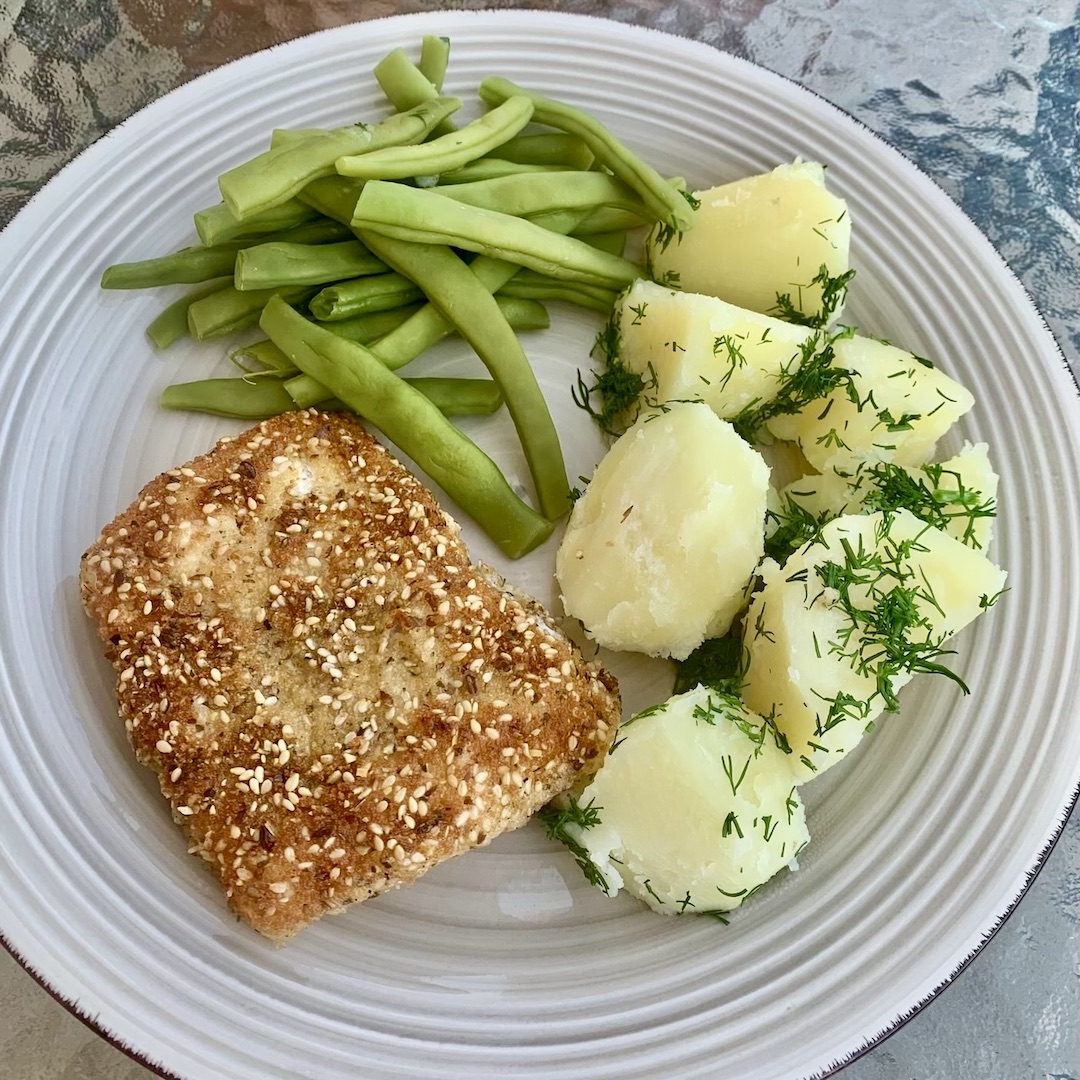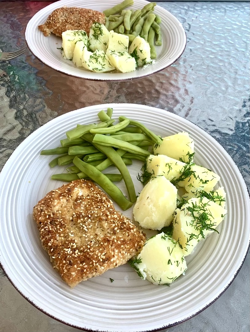 Autor poleca serwować rybę z gotowanymi ziemniakami oraz fasolką szparagową.