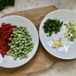 Przygotowanie warzyw: Posiekaj dymkę, rozdzielając białą i zieloną część. Obierz i posiekaj ząbek czosnku. Jeśli używasz papryki marynowanej, rozkrój ją, odsącz na ręczniku papierowym, a następnie pokrój w paski. Przygotuj dużą garść mrożonego zielonego groszku.
