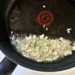 Włóż na patelnię posiekaną białą część dymki. Wstaw patelnię z powrotem na ogień i smaż, aż cebula się lekko zeszkli.