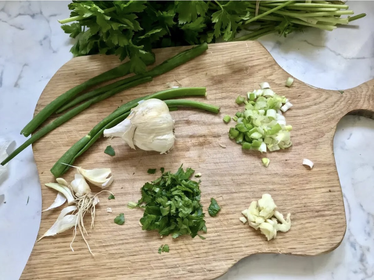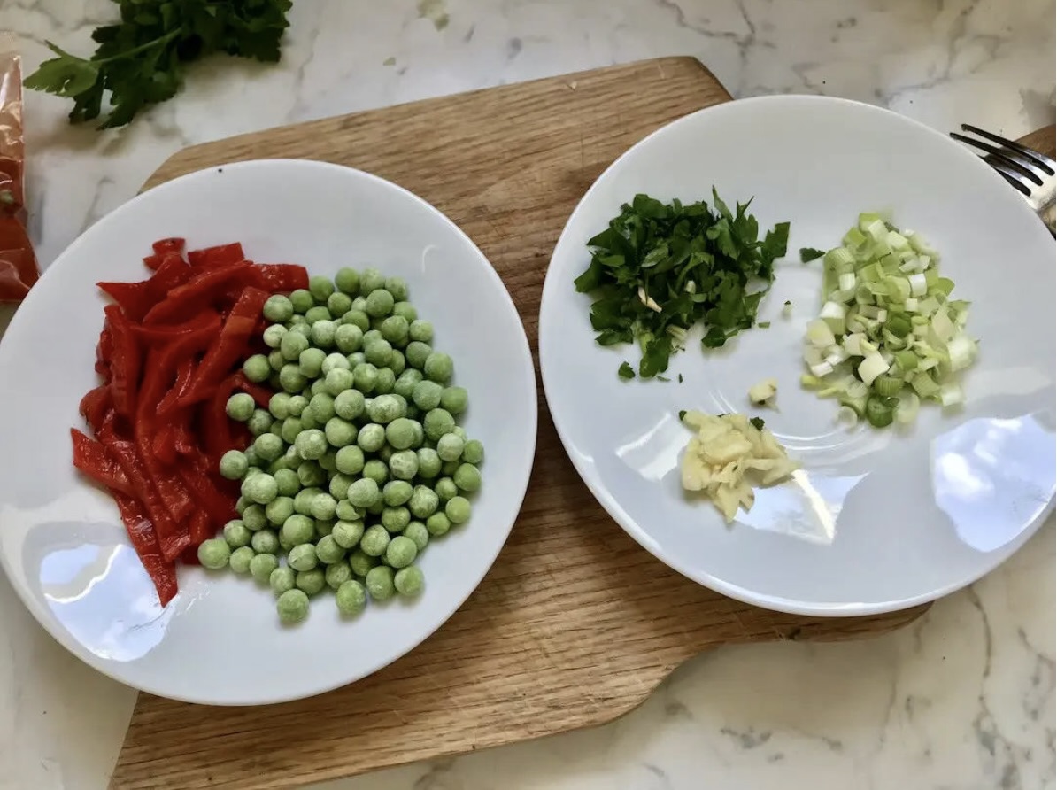 Przygotowanie warzyw: Posiekaj dymkę, rozdzielając białą i zieloną część. Obierz i posiekaj ząbek czosnku. Jeśli używasz papryki marynowanej, rozkrój ją, odsącz na ręczniku papierowym, a następnie pokrój w paski. Przygotuj dużą garść mrożonego zielonego groszku.