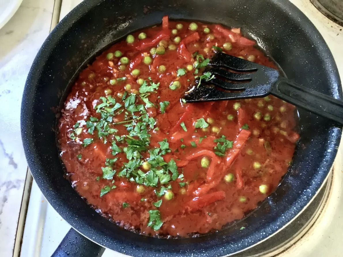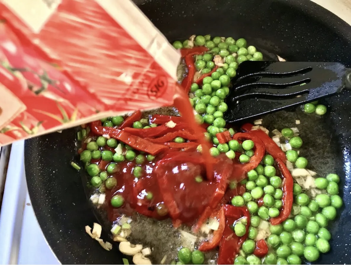 Dodaj warzywa: czosnek, groszek, paprykę, a następnie wlej niecałą szklankę przecieru pomidorowego.