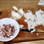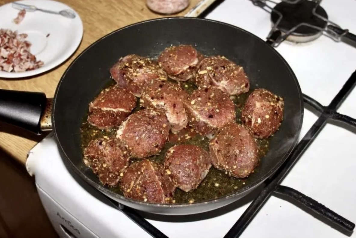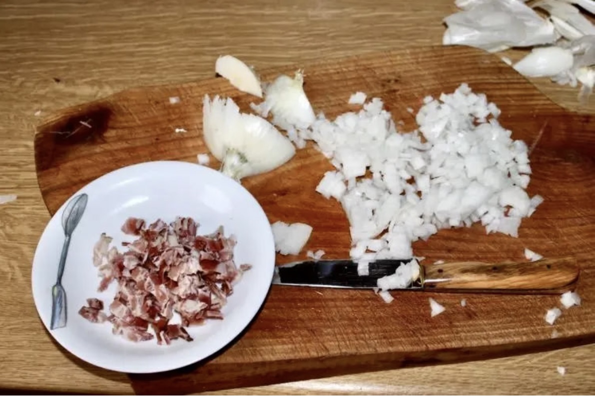 Boczek i cebula: Na patelni po mięsie podsmaż pokrojoną w kostkę pancettę (lub boczek) oraz posiekaną cebulę. Gdy się zrumienią, dodaj je do garnka z mięsem. Całość duś przez około 30 minut.