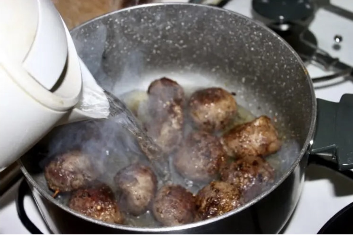 Duszenie indyka: Zrumienione mięso przełóż do garnka, zalej szklanką gorącej wody i duś pod przykryciem na małym ogniu.