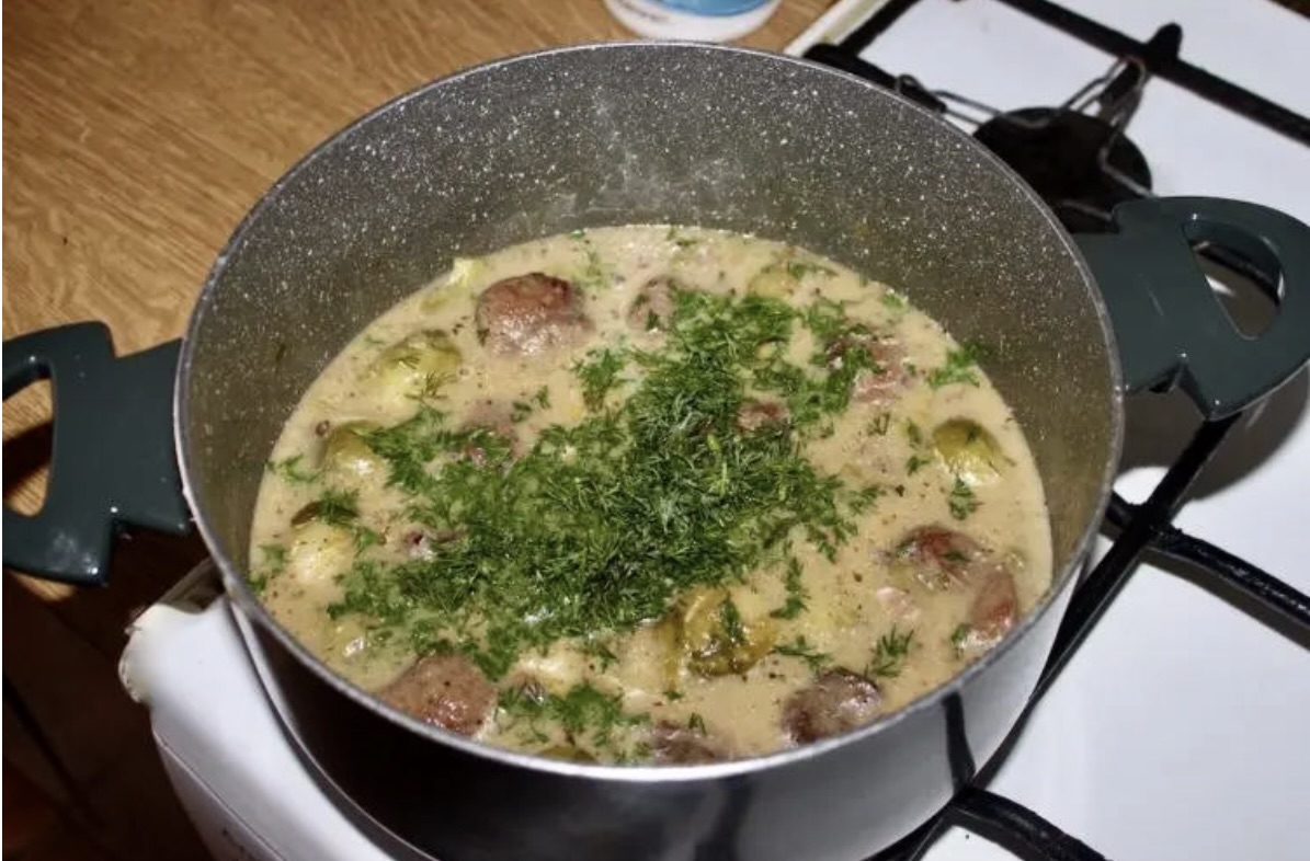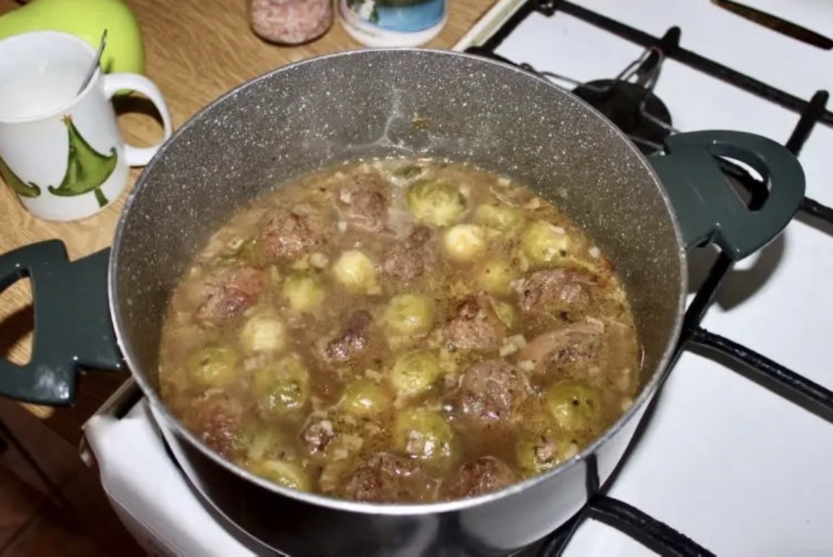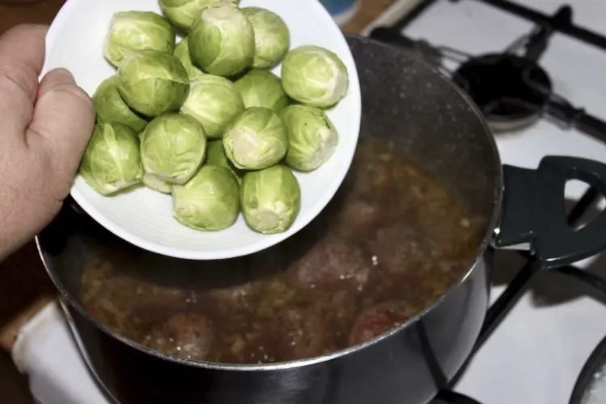 Dodanie brukselki: Po tym czasie wrzuć brukselkę do garnka, a następnie kontynuuj duszenie przez kolejne 20–30 minut, aż mięso i warzywa będą miękkie. Na koniec dopraw solą i pieprzem.