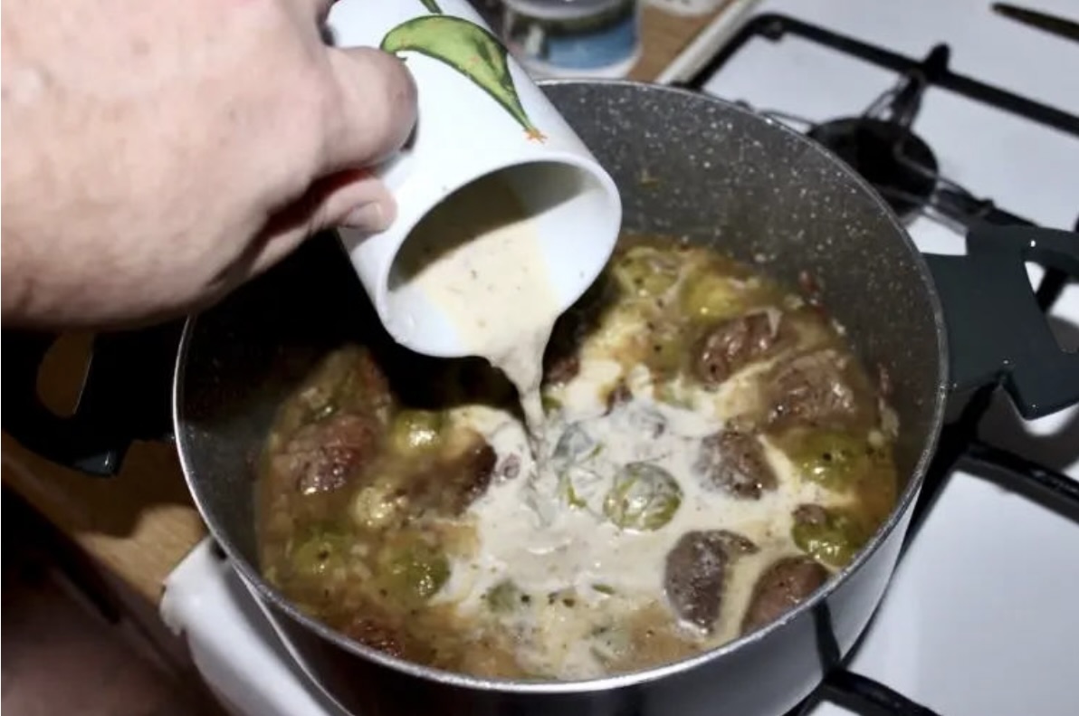 Wykończenie sosu: W kubku wymieszaj łyżeczkę mąki z odrobiną zimnej wody, dodaj 1-2 łyżki kwaśnej śmietany. Dolej do kubka trochę gorącego sosu z garnka (hartowanie), wymieszaj i wlej całość do dania. Zagotuj i wyłącz ogień.