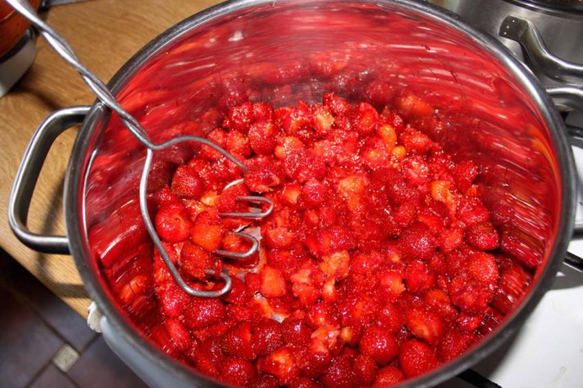 Przygotowanie owoców: Oczyść truskawki, pozbaw szypułek i dokładnie umyj. Przełóż do dużego garnka i ugnieć je, pozostawiając część w większych kawałkach (stopień ugniecenia zależy od preferencji).