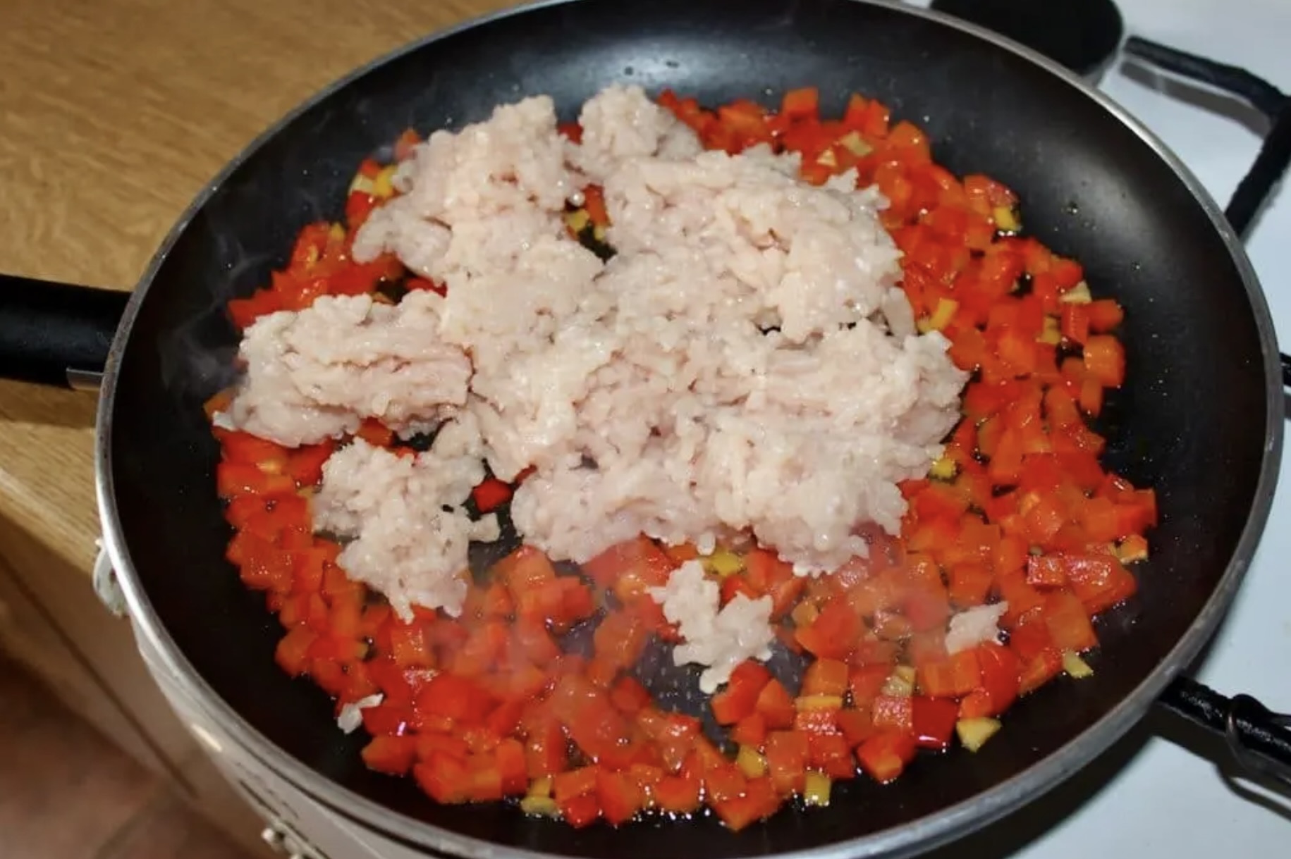 Dodaj zmielone mięso, rozdrobnij je, aby nie było grudek, i smaż wszystko razem przez kilka minut.