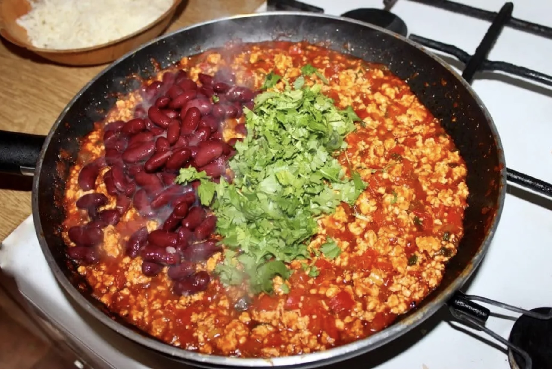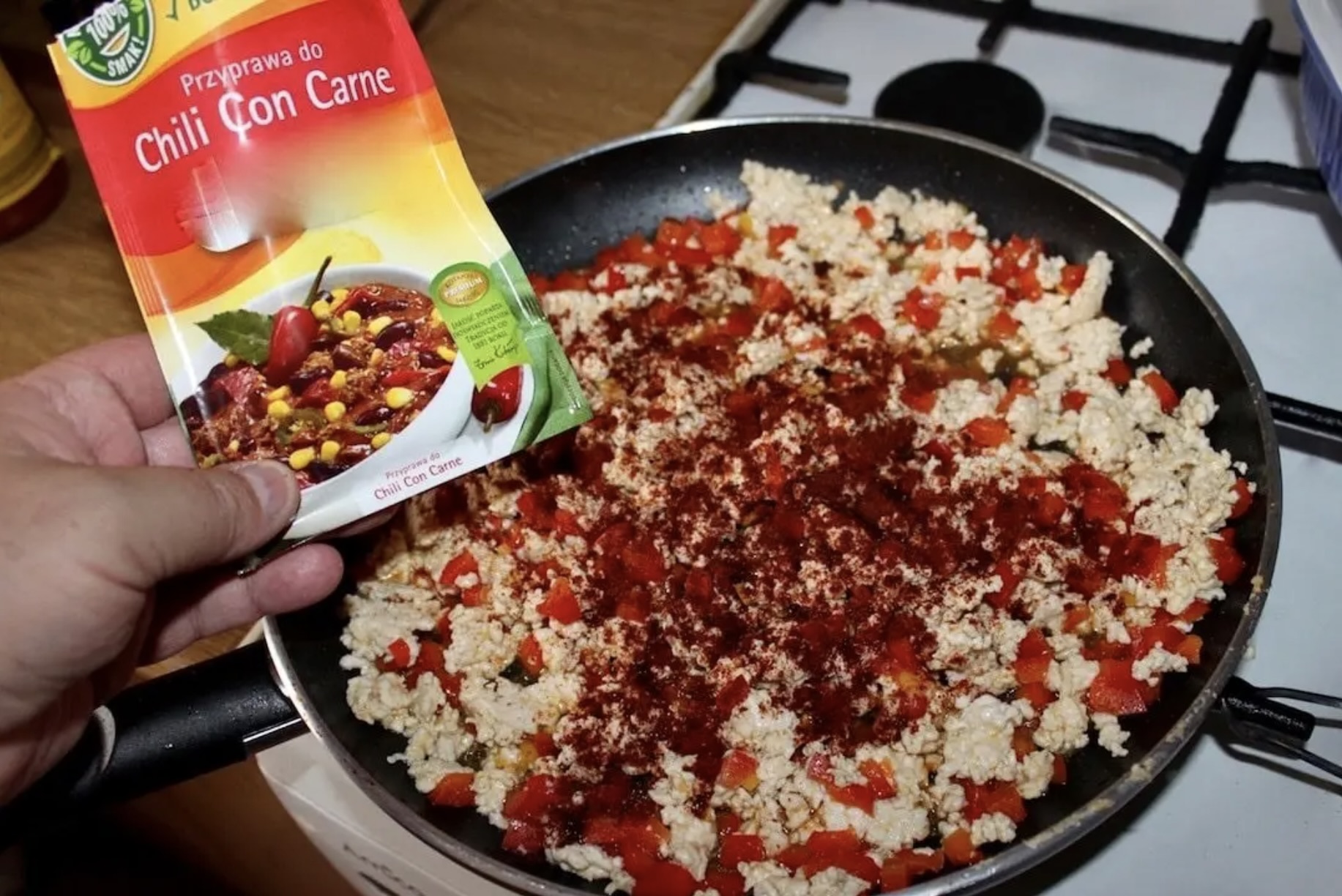 Do przesmażonego mięsa z papryczkami wsyp pół opakowania przyprawy „chilli con carne” (lub innej meksykańskiej).