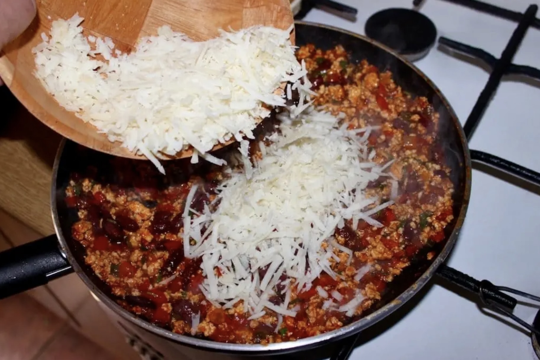 Na koniec dorzuć 200 g startego twardego sera, wyłącz gaz i zamieszaj. Farsz powinien być gęsty i odparowany, aby nie wypłynął z tortilli.