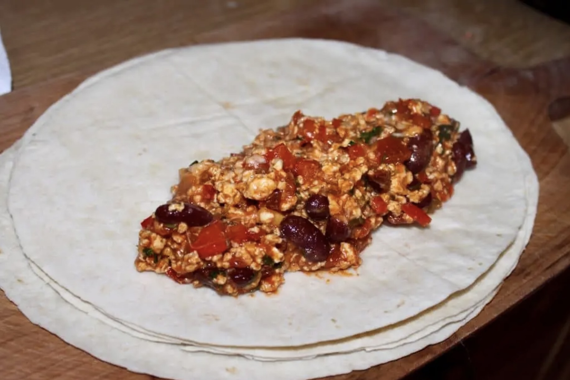 Na każdą tortillę nakładaj porcję farszu, a następnie roluj ją jak naleśnik.