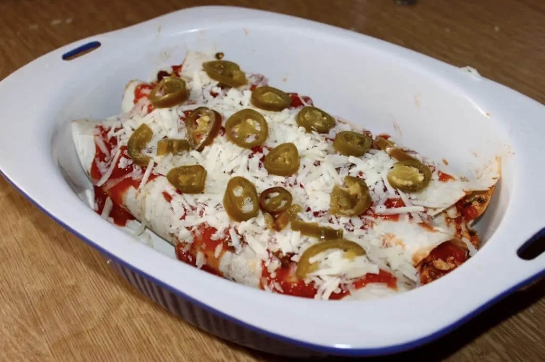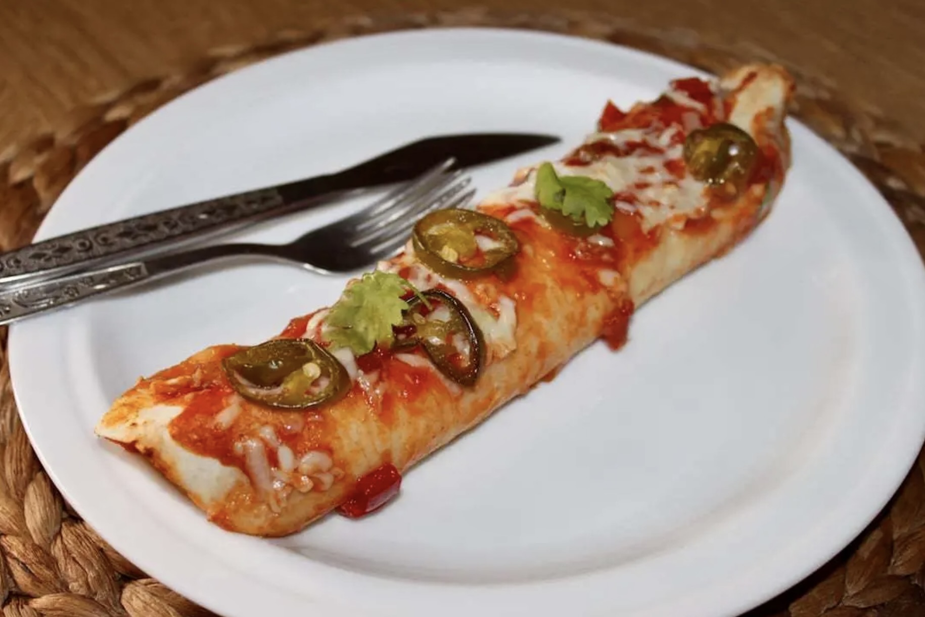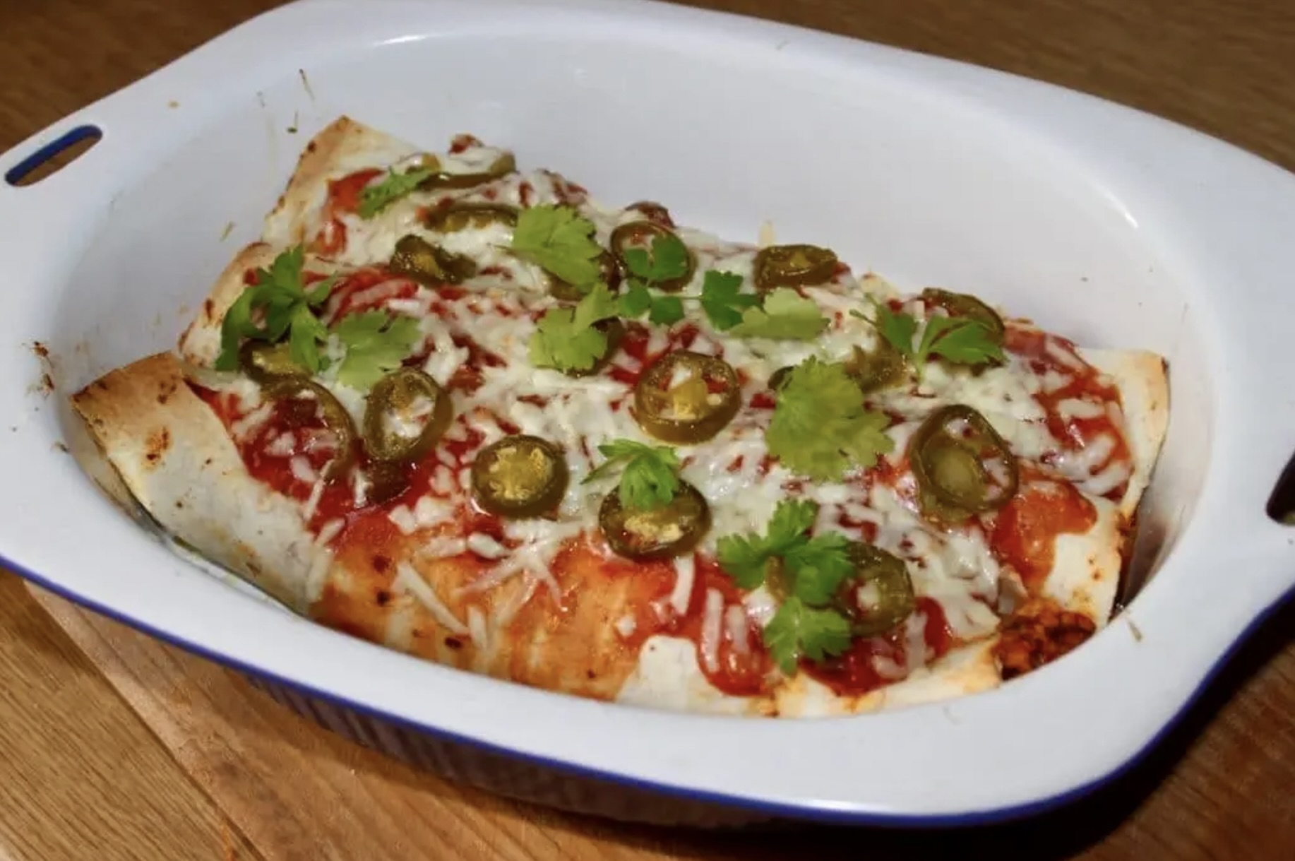 Enchilada to tortilla wypełniona farszem z aromatycznego kurczaka w sosie pomidorowym z fasolą i serem, a następnie zapieczona.