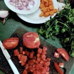 Przygotowanie warzyw: W międzyczasie marchewkę pokrój w plasterki, cebulę obierz i pokrój w drobną kostkę. Pomidory pokrój również w drobną kostkę (jeśli wolisz, możesz je wcześniej obrać ze skórki). Dymkę i natkę pietruszki drobno posiekaj.