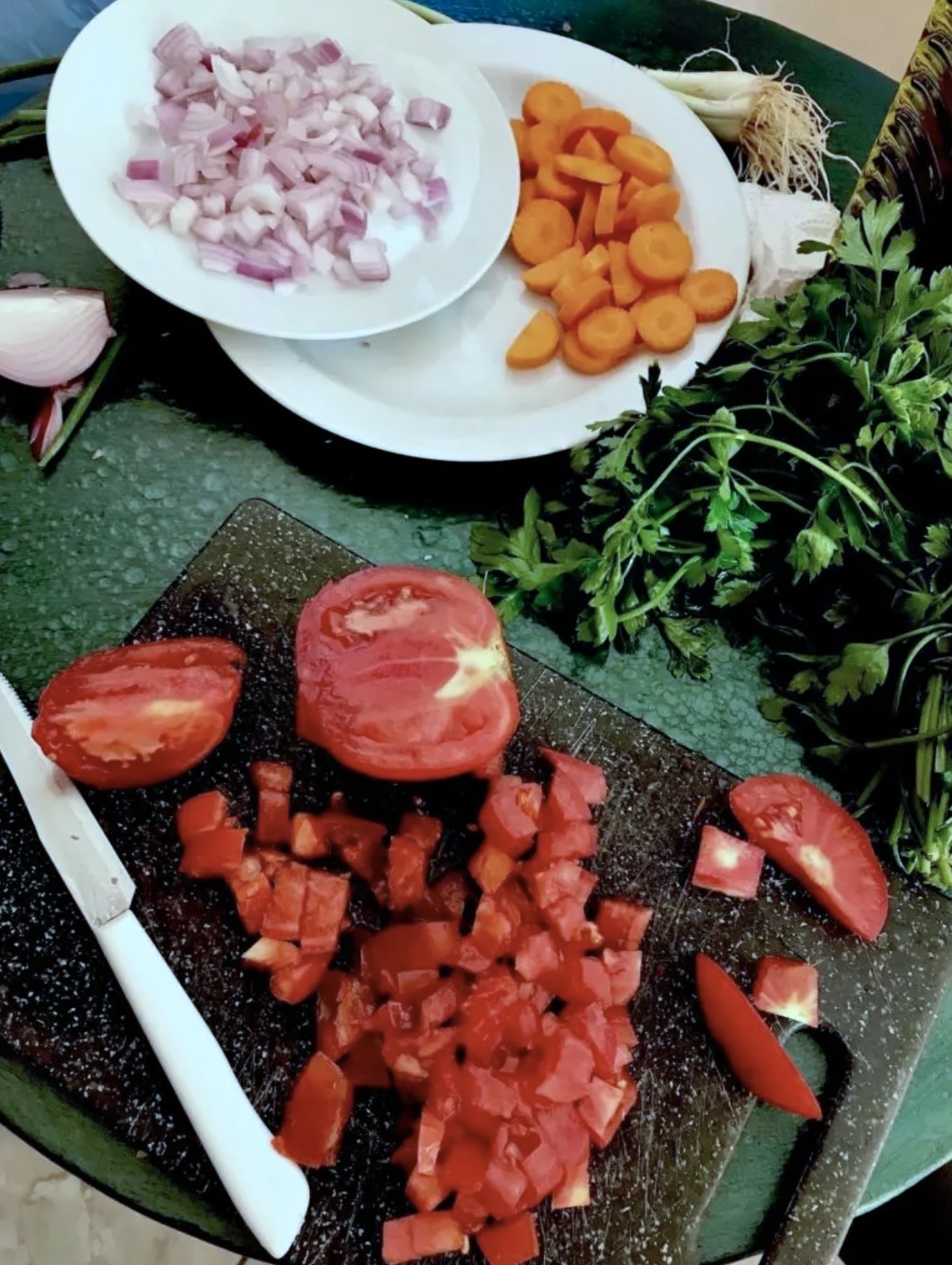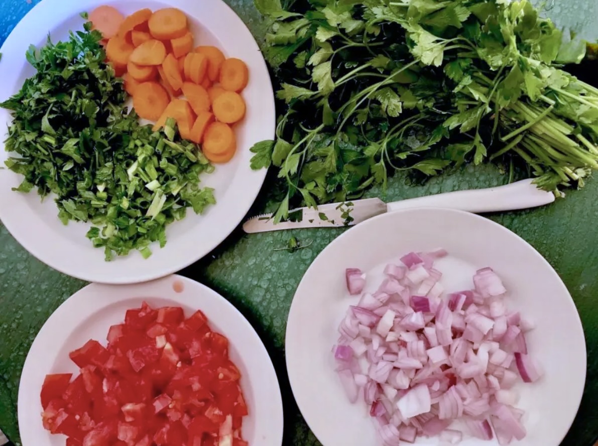 Przygotowanie warzyw: W międzyczasie marchewkę pokrój w plasterki, cebulę obierz i pokrój w drobną kostkę. Pomidory pokrój również w drobną kostkę (jeśli wolisz, możesz je wcześniej obrać ze skórki). Dymkę i natkę pietruszki drobno posiekaj.
