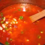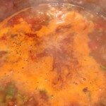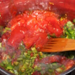 Dodaj zieloną paprykę, a następnie wlej puszkę pomidorów.