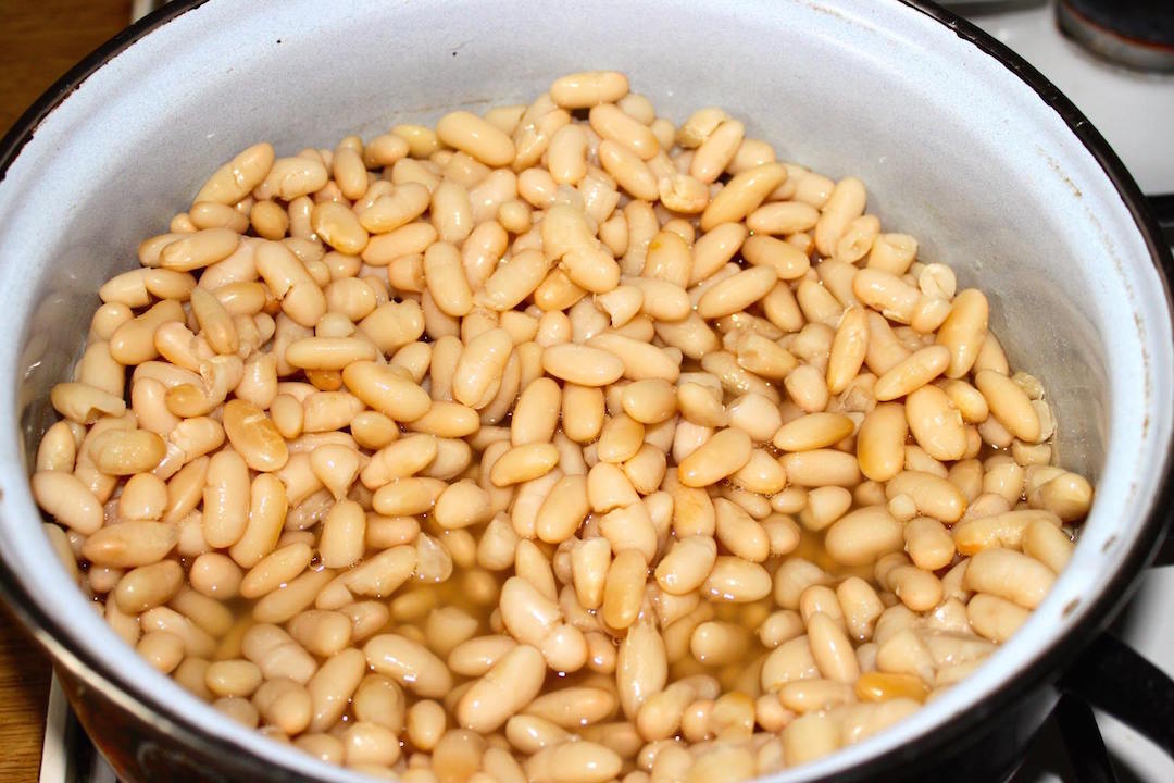Przygotowanie fasolki: Białą, drobną fasolkę namocz przez noc w przegotowanej, ostudzonej wodzie. Rano odcedź, zalej świeżą zimną wodą i gotuj przez około godzinę, aż zmięknie.