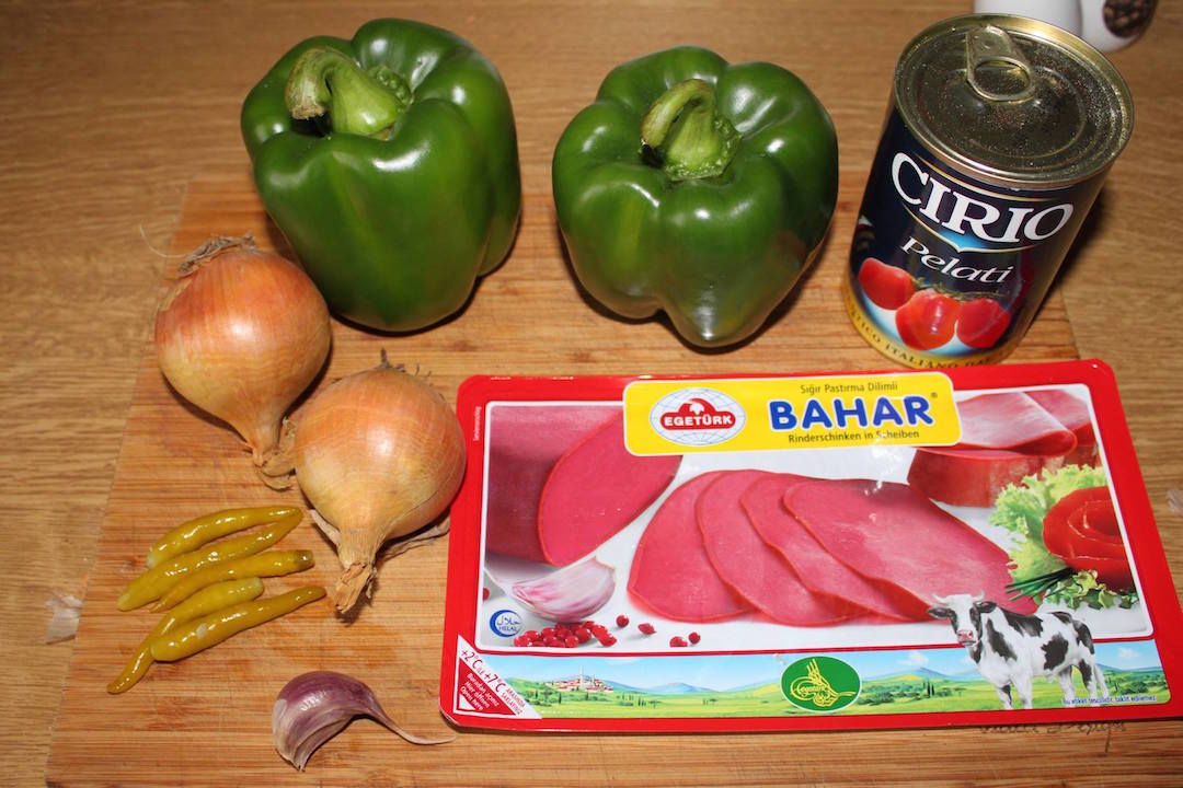 Przygotowanie warzyw i mięsa: W międzyczasie oczyść i pokrój papryki oraz cebule w drobną kostkę. Pokrój peperoni na małe kawałeczki (pamiętaj, że są bardzo ostre; jeśli wolisz łagodniejszą wersję, użyj mniej lub usuń pestki). Cieniutkie plasterki pastirmy pokrój w paseczki.