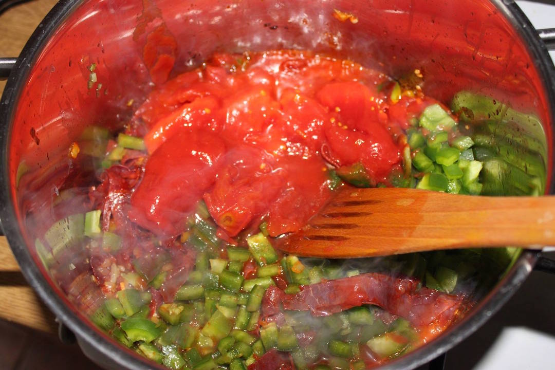 Dodaj zieloną paprykę, a następnie wlej puszkę pomidorów.