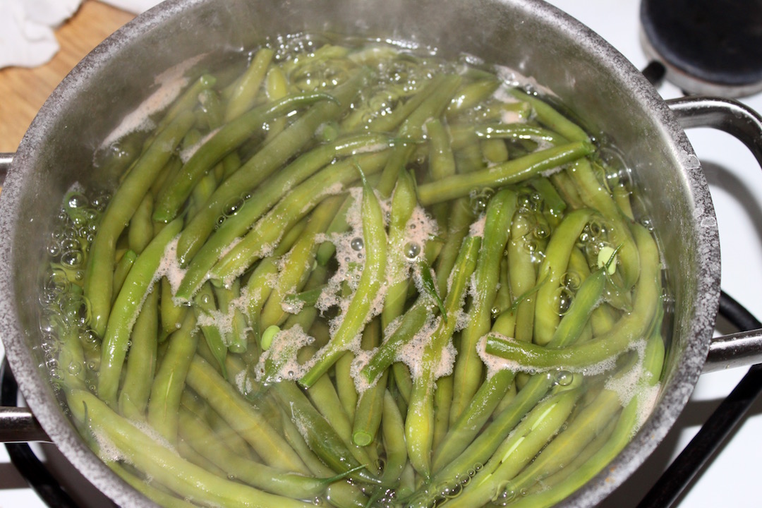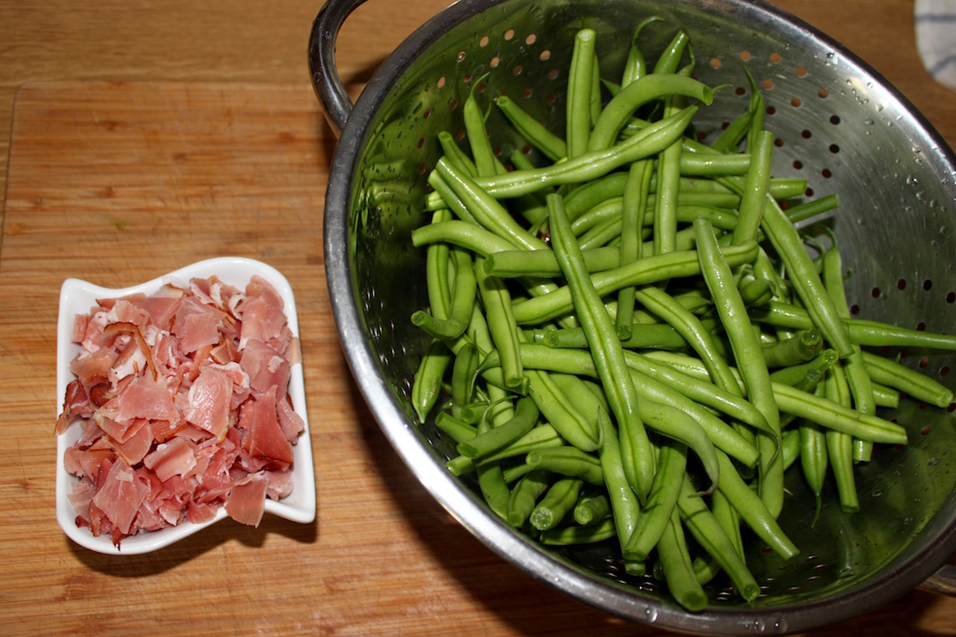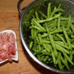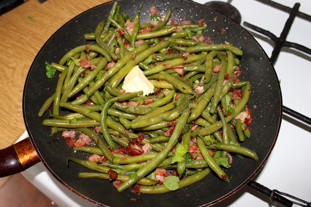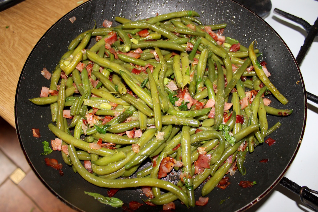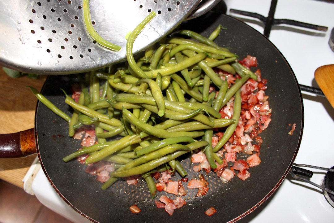 Łączenie: Wrzuć odcedzoną fasolkę na patelnię do przesmażonej szynki. Ogień powinien być mały.