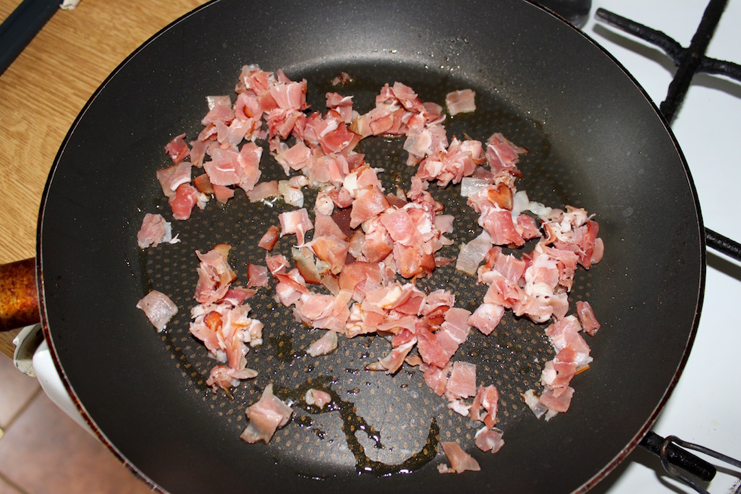 Szynka: Szynkę szwarcwaldzką pokrój w kostkę i podsmaż na patelni bez dodatku tłuszczu, aż się wytopi.