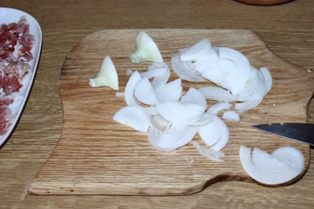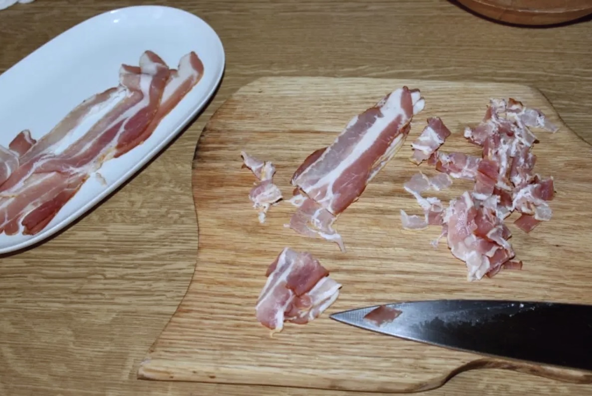 Składniki na wierzch: W międzyczasie pokrój cebulę w drobne piórka. Boczek posiekaj w drobną kostkę lub paseczki.