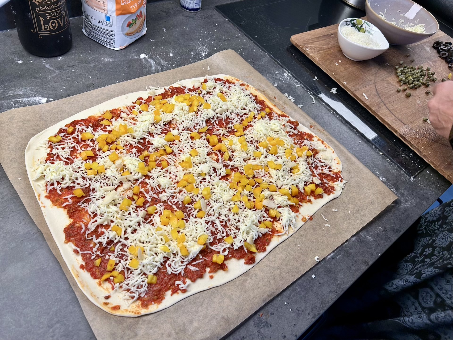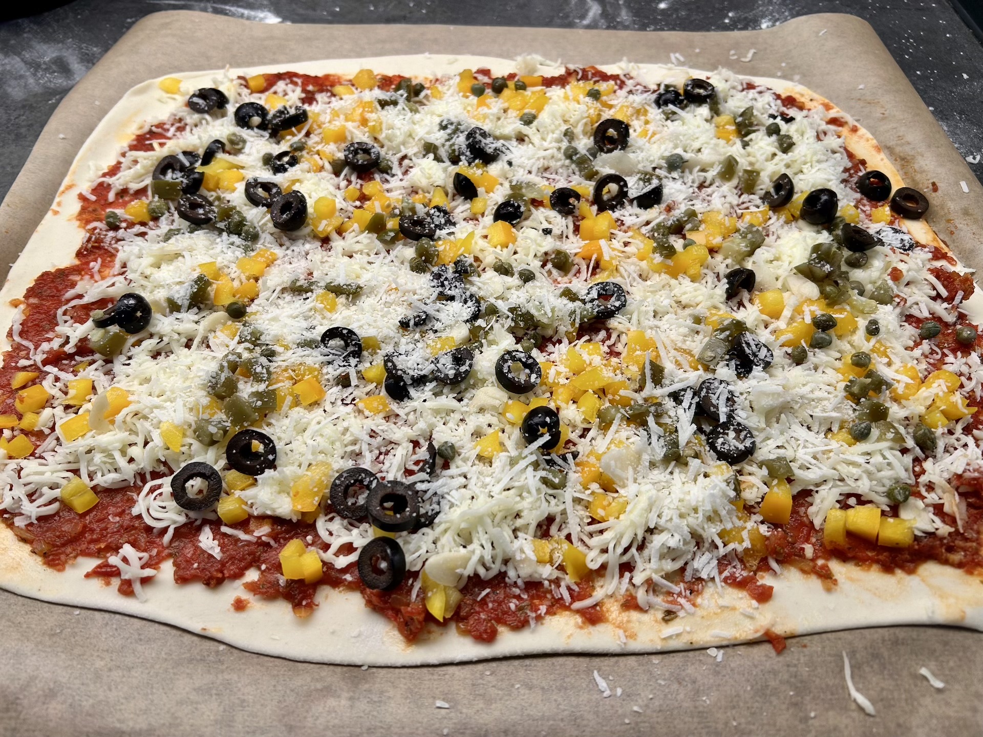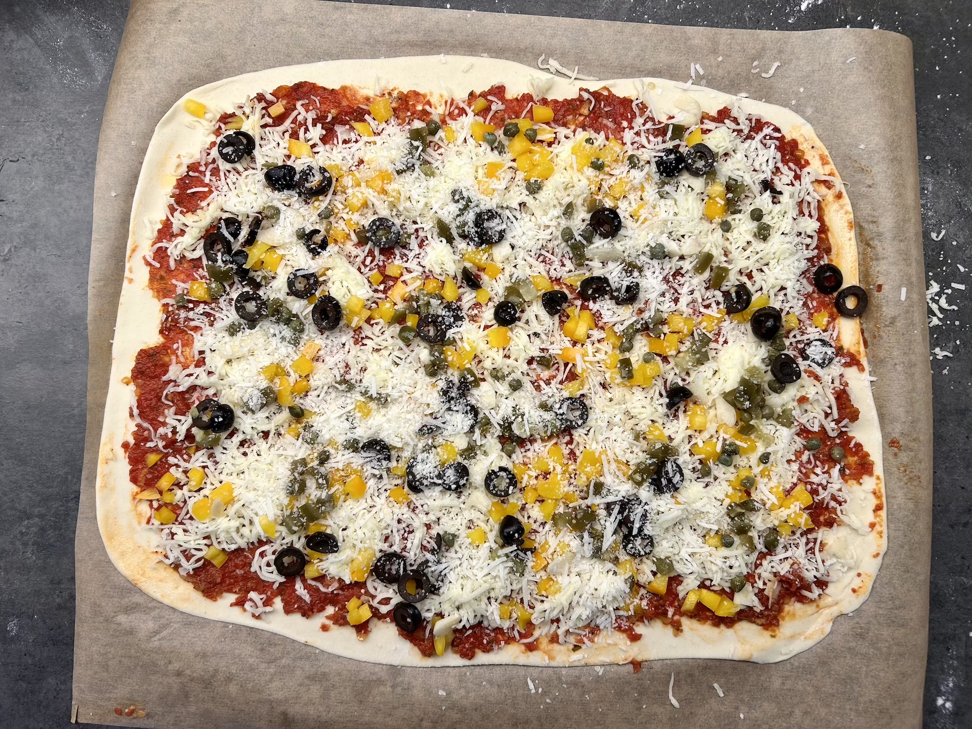 Nakładanie składników: Rozsmaruj na cieście sos pomidorowy (nie za dużo). Rozłóż paprykę oraz połowę startej mozzarelli. Dodaj kapary, oliwki i paprykę jalapeno. Całość posyp drugą połową mozzarelli (i ewentualnie Grana Padano/parmezanem).