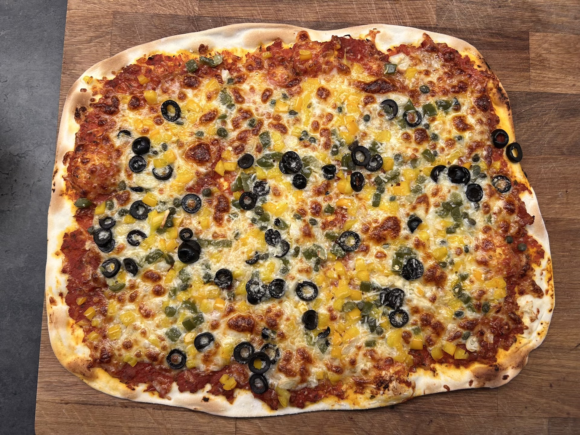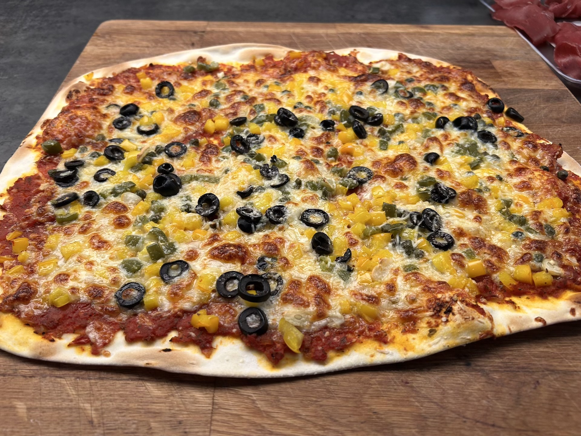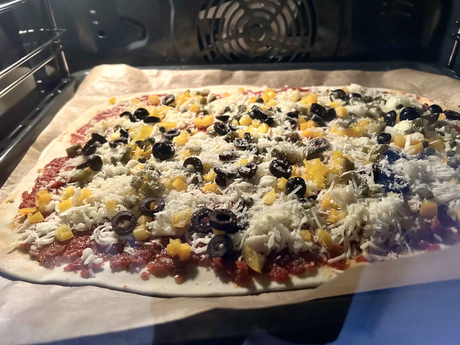 Nakładanie składników: Rozsmaruj na cieście sos pomidorowy (nie za dużo). Rozłóż paprykę oraz połowę startej mozzarelli. Dodaj kapary, oliwki i paprykę jalapeno. Całość posyp drugą połową mozzarelli (i ewentualnie Grana Padano/parmezanem).