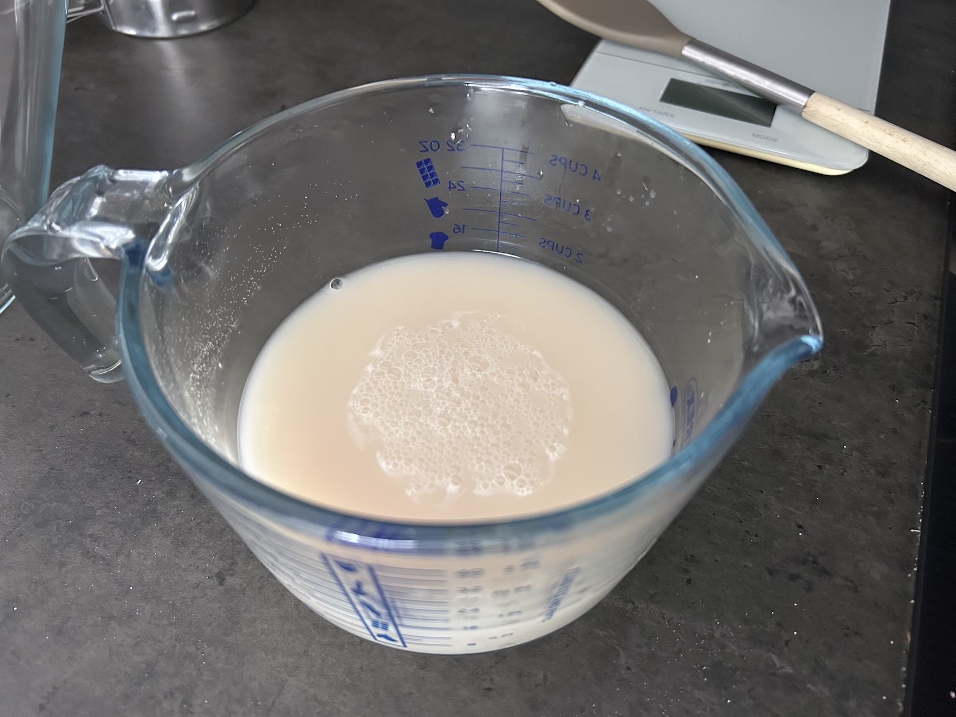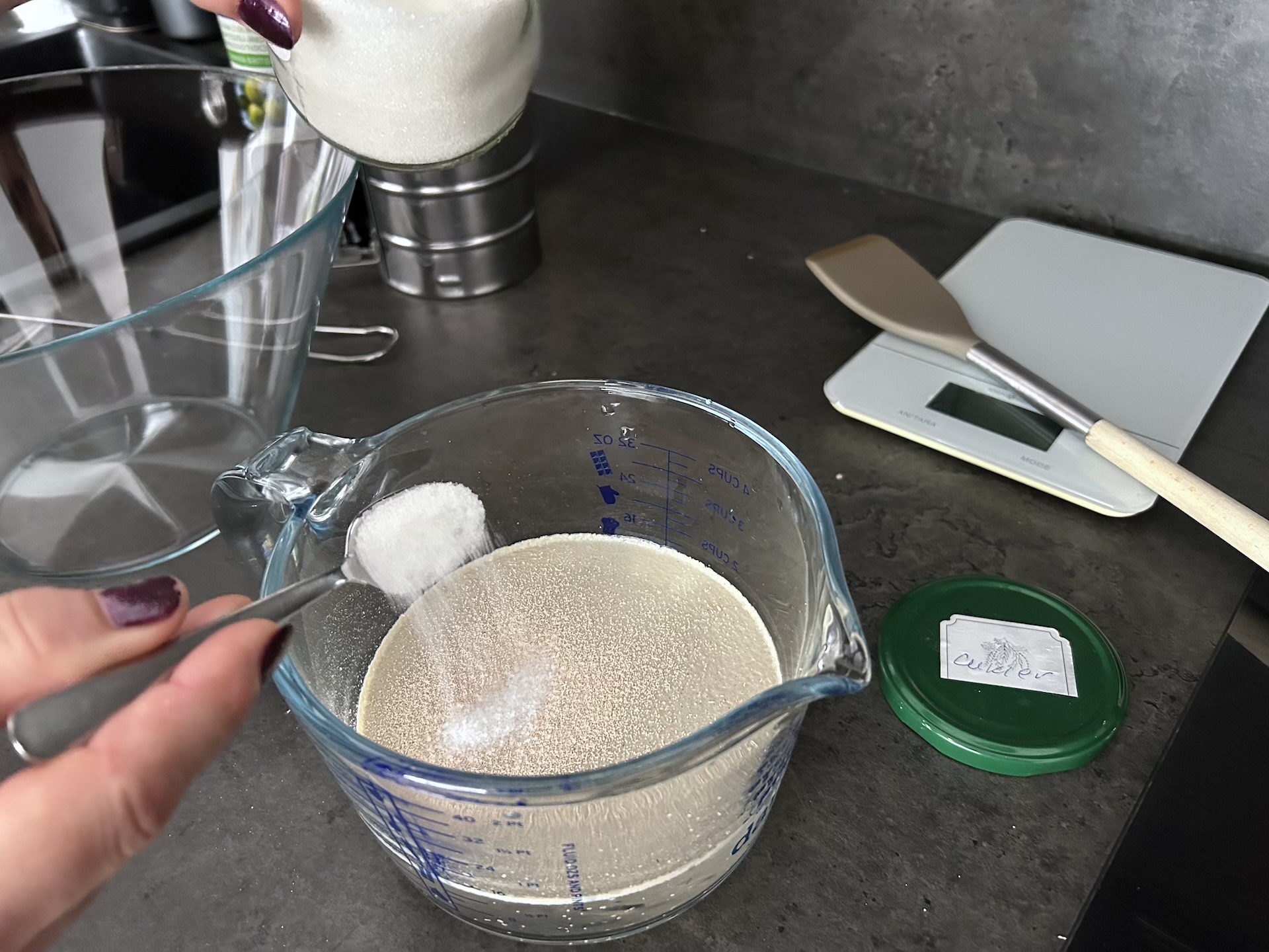 Przygotowanie zaczynu: Do naczynia z letnią wodą (400 ml) wsyp suszone drożdże i łyżeczkę cukru. Dokładnie wymieszaj, aż drożdże się rozpuszczą, i odstaw na chwilę.