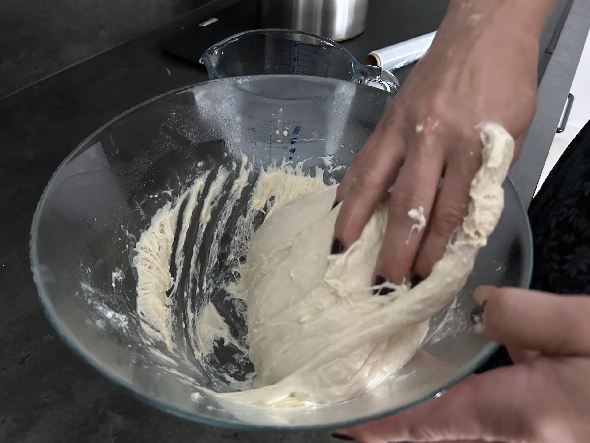 Ponowne składanie: Ponów czynności składania boków ciasta (zwilżoną dłonią) i lekkiego odwracania. Ciasto powinno już mieć bąble.