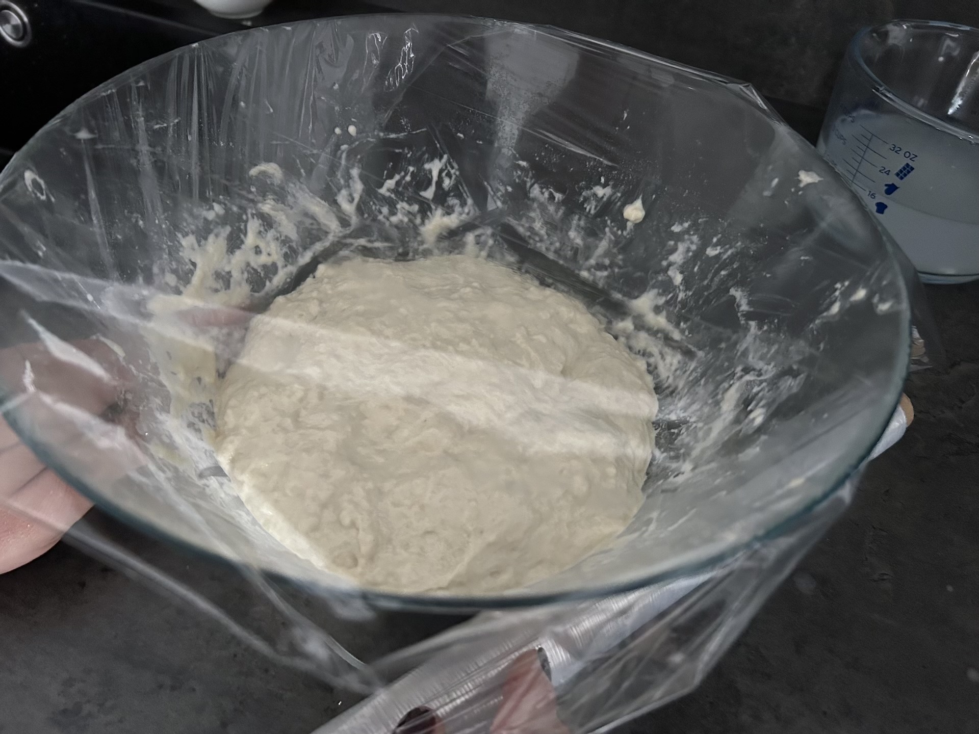 Drugie wyrastanie: Przykryj miskę folią spożywczą i ściereczką i daj ciastu odpocząć przez kolejne 30 minut.