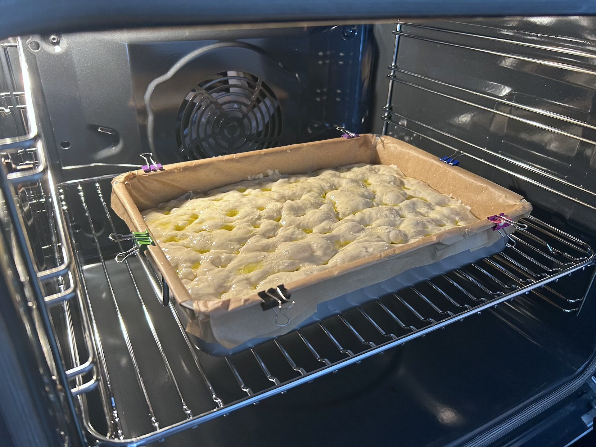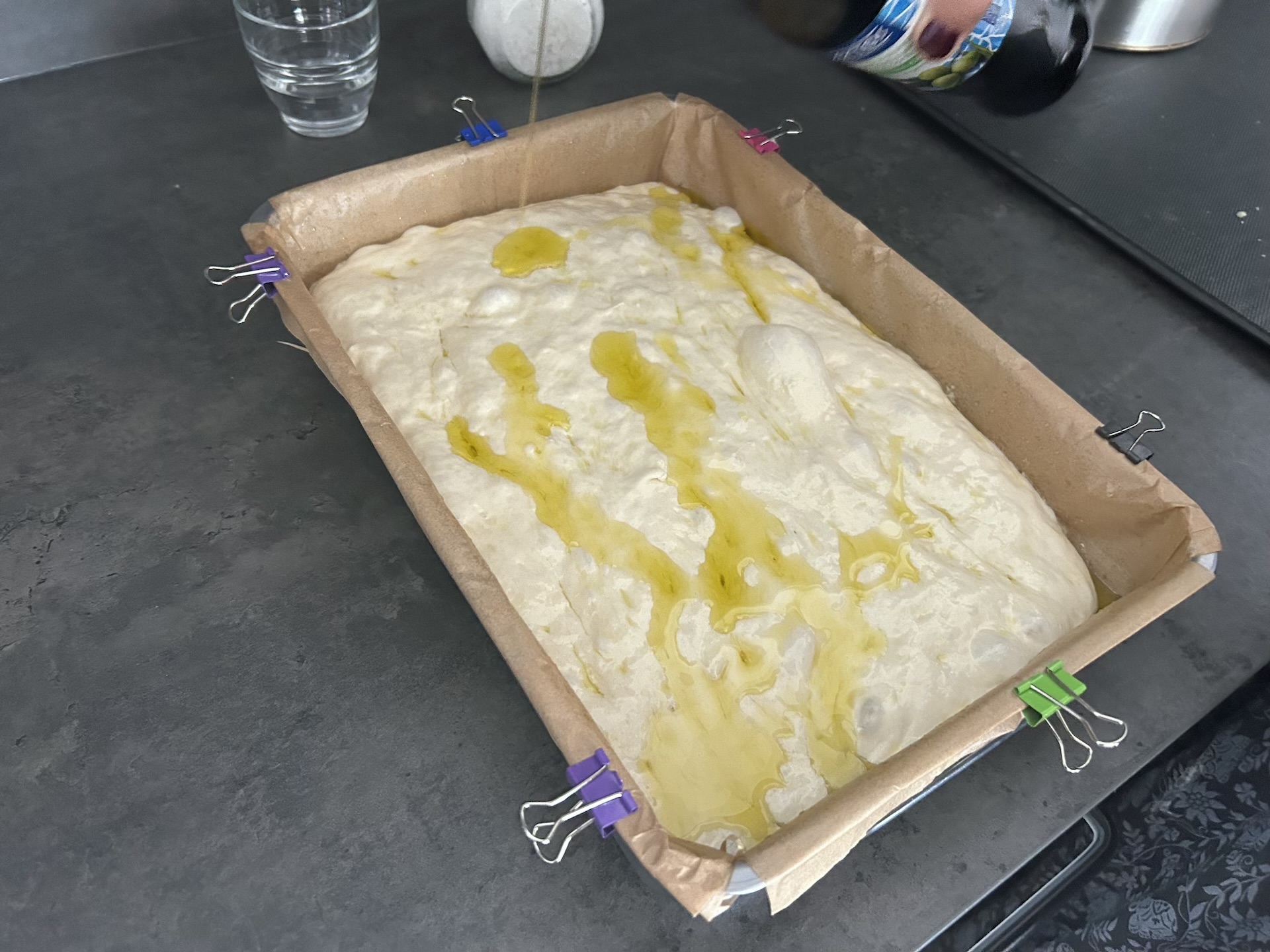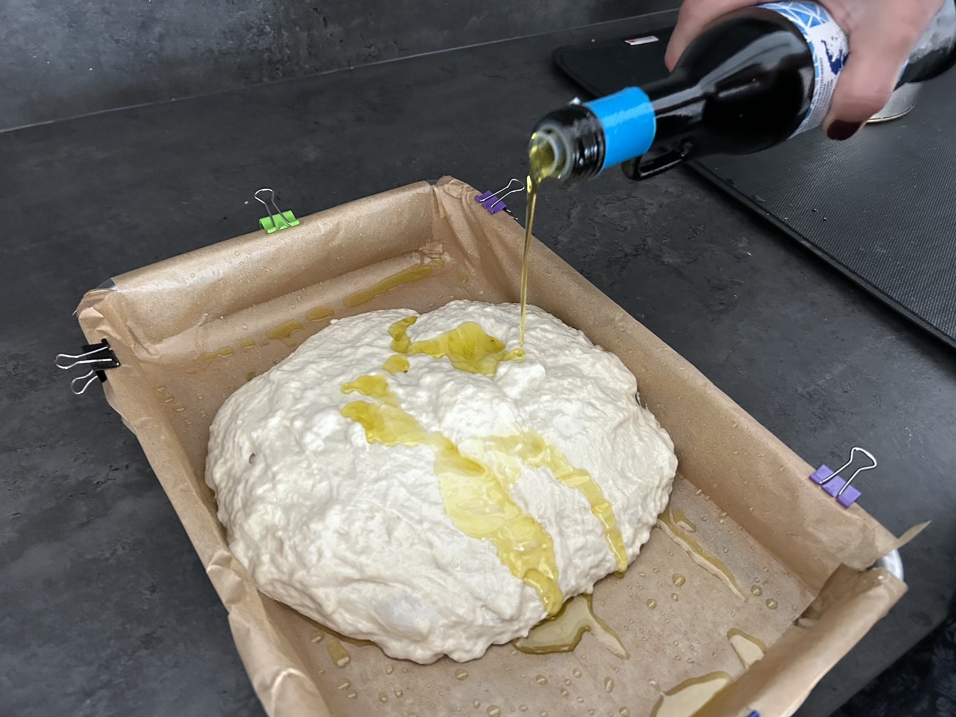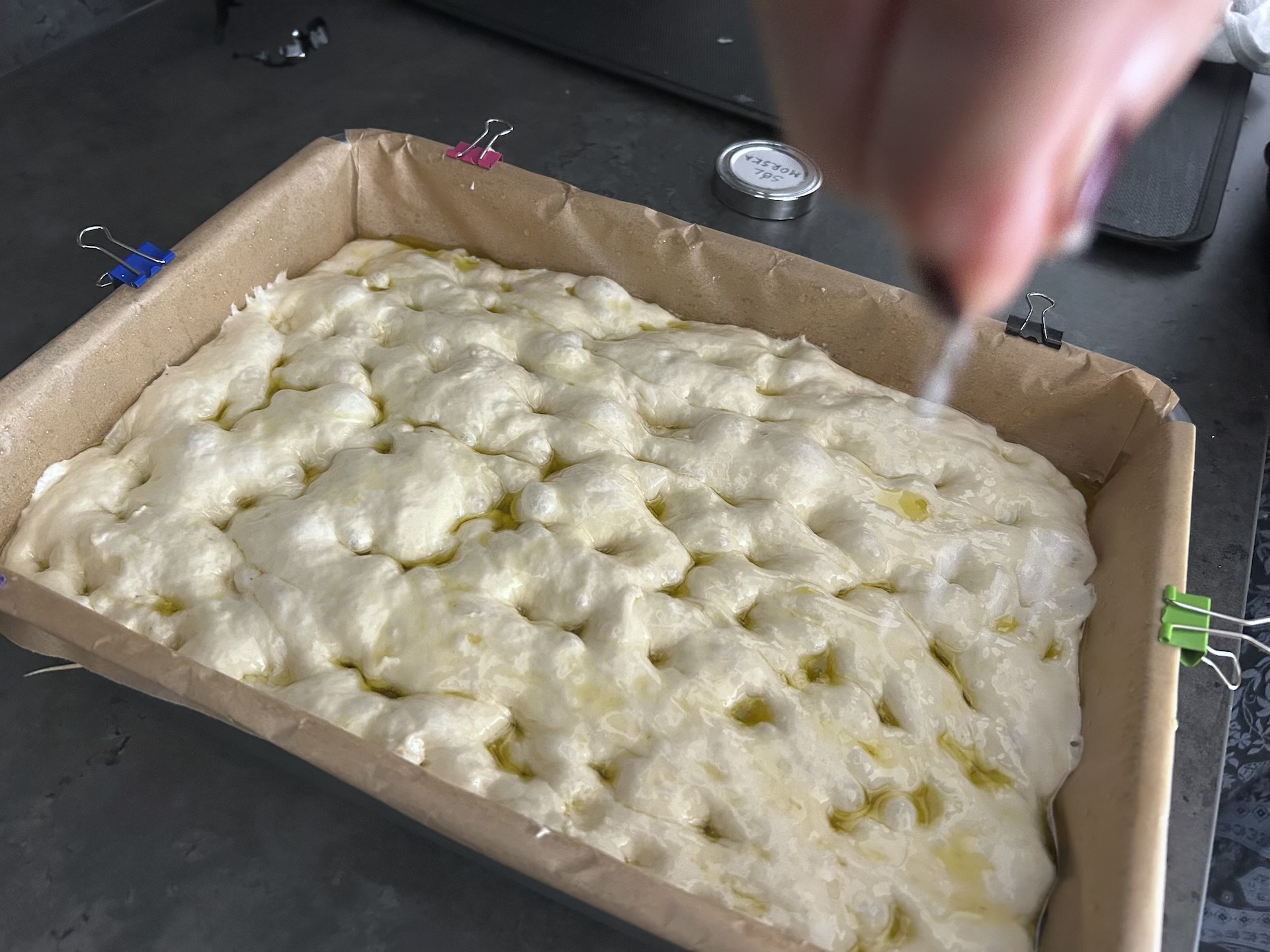 Ostatnie przygotowanie: Focaccię polej jeszcze oliwą. Zrób ponownie wgłębienia palcami (aż do blachy). Posyp wierzch ciasta odrobiną grubej soli.