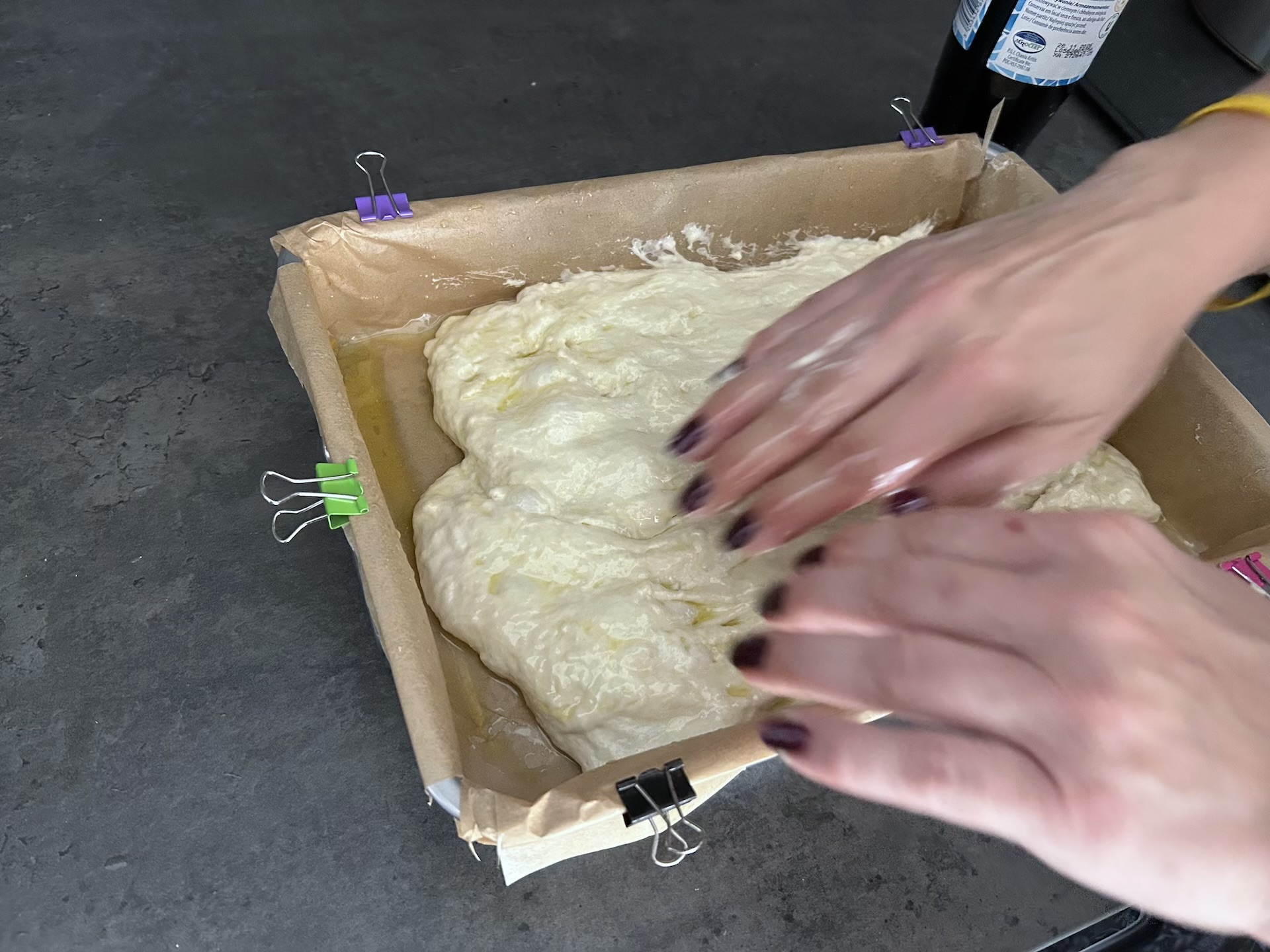 Rozkładanie ciasta i wgłębienia: Polej ciasto obficie oliwą z oliwek, a następnie delikatnie wmasuj ją w ciasto, jednocześnie rozkładając je na powierzchni blachy. Zrób palcami wgłębienia w cieście.
